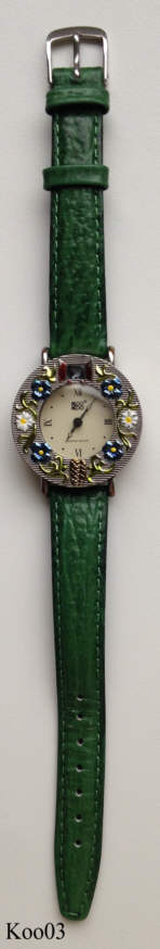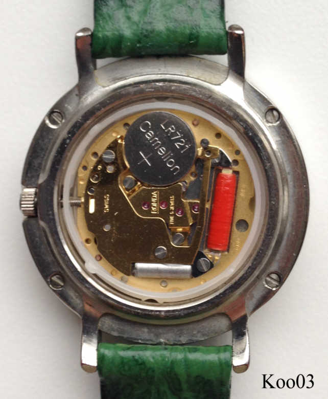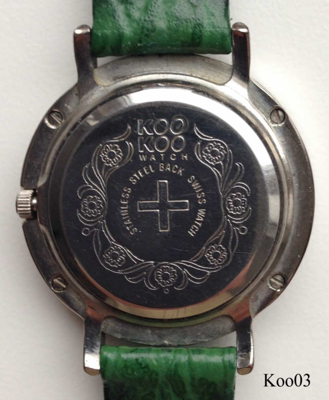 This is a Swiss Ladies KooKoo wristwatch! In the window above “12” white birds circle, one of them is red to indicate the full minute Signed front: ”KooKoo, Swiss made”, back: ”KooKoo Watch, Stainless Steel Back, Swiss Made” Harley Ronda movement 3873, Five 5 Jewels, green country leather band, 32 mm diameter. Distributed in 1993 by “No Time AG” of Fossil Group Europe, the matching mens watch is here.