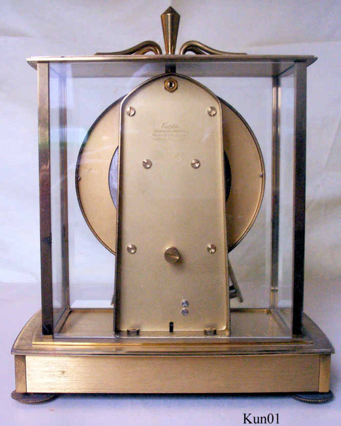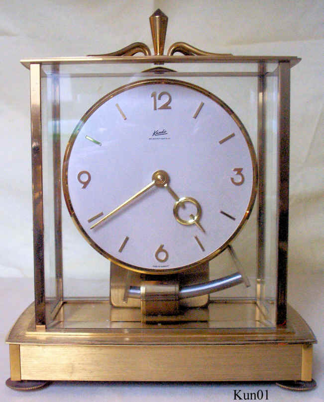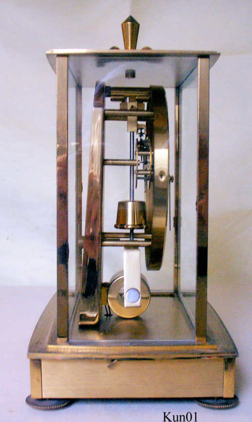 A Kundo ATO fireside clock, signed front: “Kundo, Electronic, Made in Germany”, back: “Kundo, Kieninger + Obergfell, Made in West-Germany, No (0) Jewels, unadjusted”. The movement is driven by a magnet coil below the “6” that is switched on and off moving the pendulum back and forth. The Battery is in the base stand.