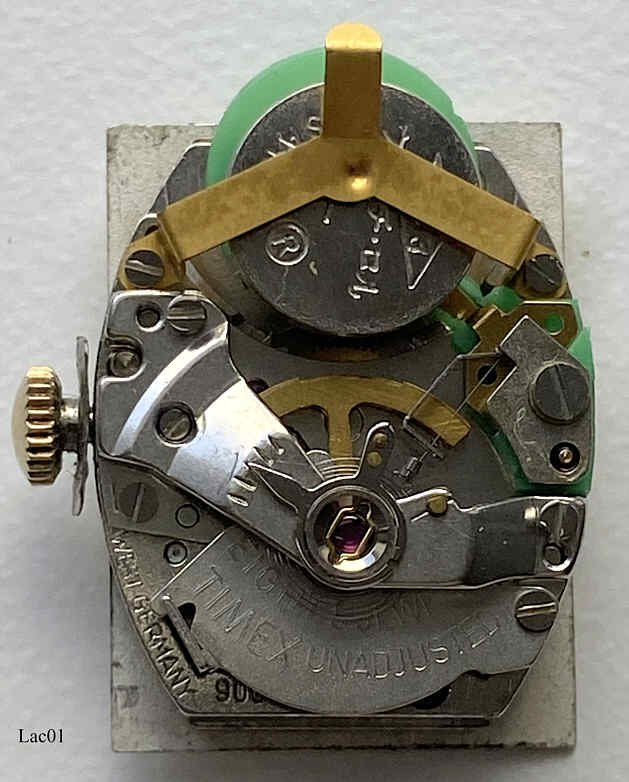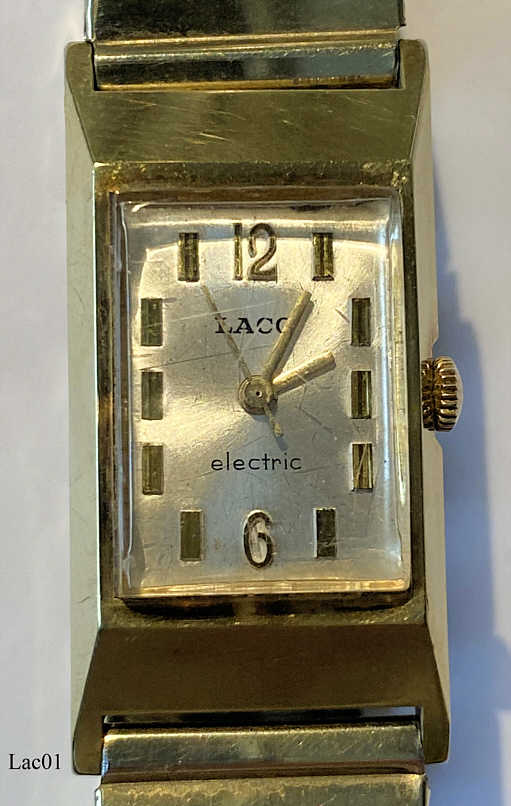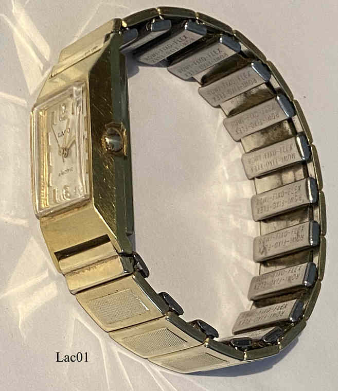Dies ist eine Damen Laco electric, sie verwendet ein Electric Werk von Timex, Caliber Timex 900. Die Unruhe wird über eine elektrisch angesteuerte Spule in ein Magnetfeld gezogen, über Kontakte wird der Stromkreis unterbrochen, die Unruhe schwingt zurück, der Stromkreis wird wieder geschlossen......Die Uhr hat ein ansprechendes Gehäuse in Goldfarben mit Rowi Fixo Flex Armband. Beschriftet vorn: “Timex, Electric”, hinten: “LACO”, innen: “Timex, Unadjusted, Eight 8 Jewels, West Germany, 900”.