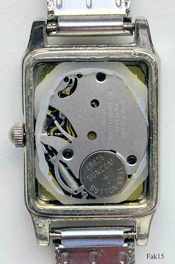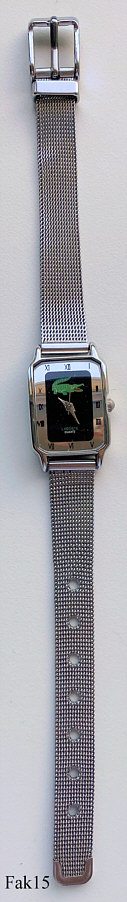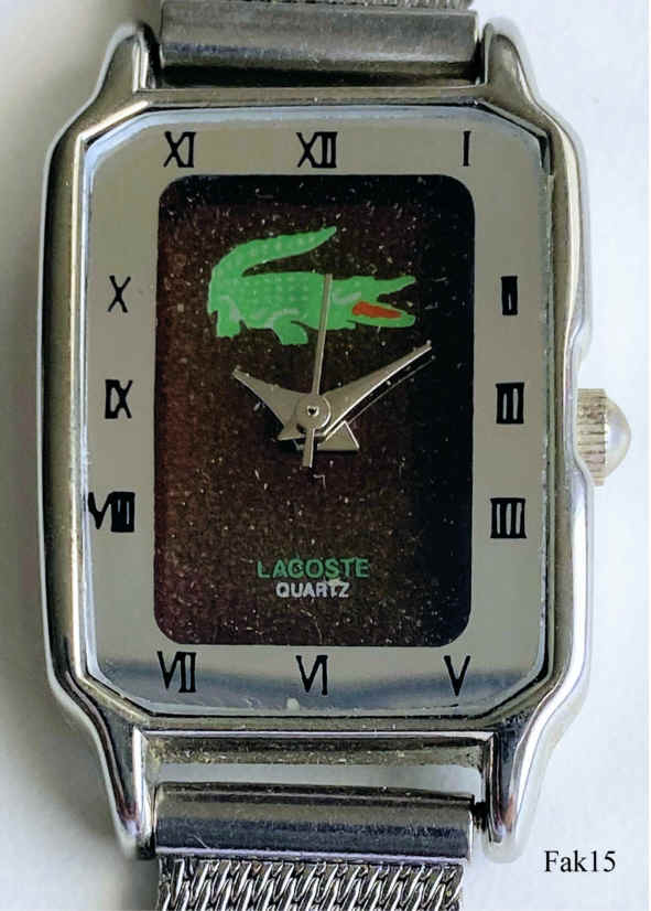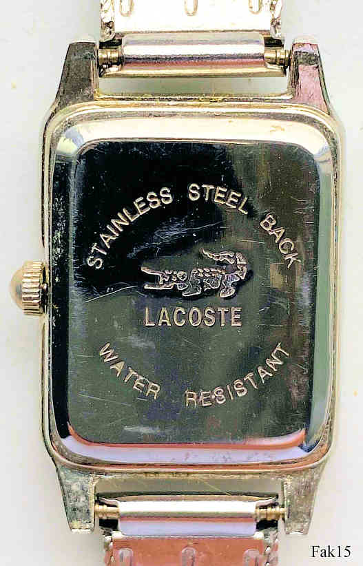 Dies ist eine nachempfundene Lacoste Damenuhr, ein billiger Nachbau, den es tatsächlich nicht gibt. Innen ein einfaches chinesisches Quartz Werk, als Swiss Ebauche bezeichnet. Beschriftet vorn: “Lacoste, Quartz”, innen: “682.11, Swiss Ebauche LTD, Movt. China, No 0 Jewels”, hinten :”Stainless Steel Back, Falsches Lacoste Logo (Seitenverkehrt) , Lacoste, Water Resistant”, Milanaise Armband