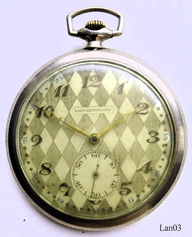Eine sehr schöne Taschenuhr der Firma Langendorf. Beschriftung vorne: “Langendorf”, innen: “S”, auf dem Werk: “Swiss Made” Sie hat ein sehr schönes Rauten Zifferblatt mit geschwungenen Ziffern, Sekunde bei der “6”. Auch die Zeiger sind sehr schön gemustert.