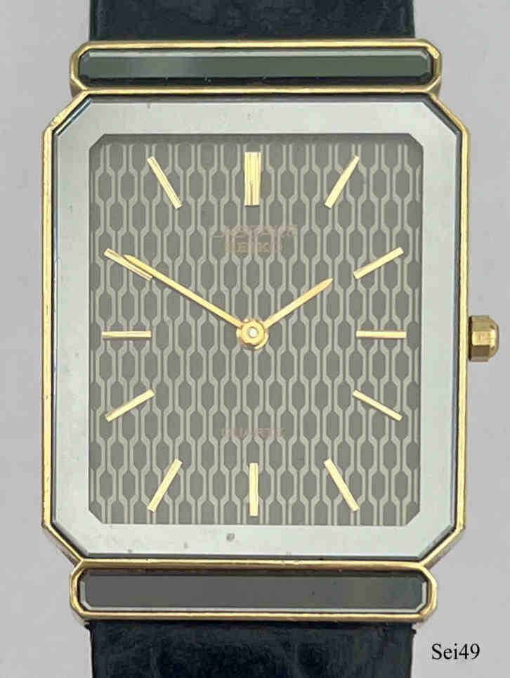 Dies ist eine Seiko Lassale Quartz Herrenuhr. Beschriftung vorn: ” Lassale, Seiko, Quartz”, hinten: ”Base Metal, St. Steel Back, 7750-5089, RO, 353155”, innen: “Japan, 7750A, Unadjusted, six Jewels, Seiko Time Corp.”. Schwarzes Lederarmband. Dies ist eine der flachsten Uhren der Welt zu ihrer Zeit, wie z.B. die Concord. Die Uhr ist nur 3 mm dick! Kaliber 7750A.