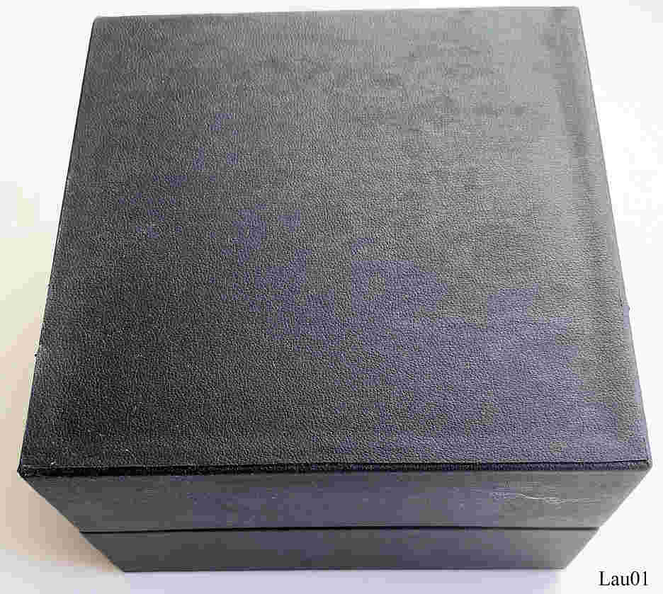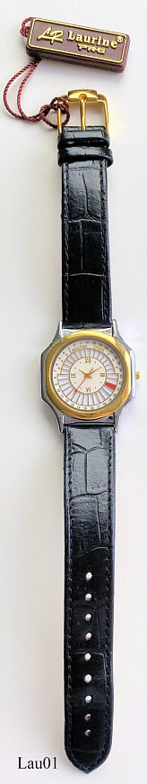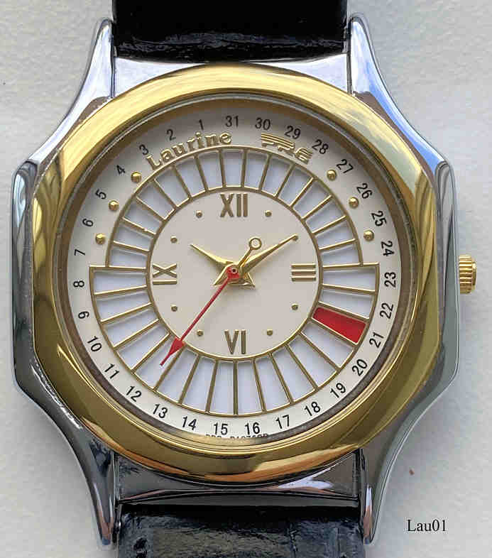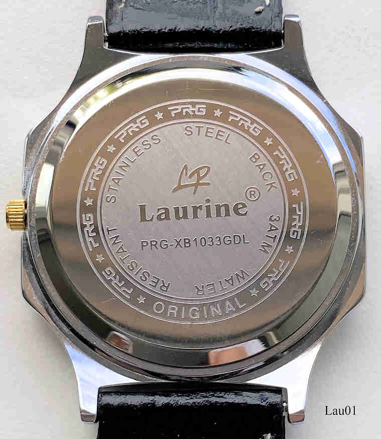 Dies ist eine Laurine Damenuhr mit ungewöhnlicher Datumsanzeige. Ein rotes Feld läuft links herum unter den 31 Fenstern durch. Beschriftet vorn: ”Laurine, PRG-B1033GD”, hinten: ”LP, Laurine, PRG-XB1033GDL, Stainless Steel Back, 3 ATM Water Resistant, Original PRG”, innen: “1, Japan, No Jewels, S.Epson Corp., VX42E”, Angetrieben von einem Epson Werk Kaliber VX42E, 0 Jewels, schwarzes Lederband.
