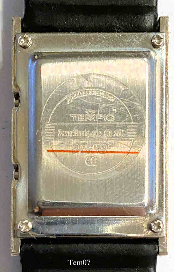 This is a ladies wood watch from Tempic with a wooden dial. Signed front: “Tempic, Quartz”, back: ”Stainless Steel Back, Tempic, Zuverlässig wie die Zeit, Art. Nr.: 856/515, Batt.: V362, CE”, inside: ”Kantec Elect. LTD, 22.Nov.1999, AE3001-1”, Black Leather Band.