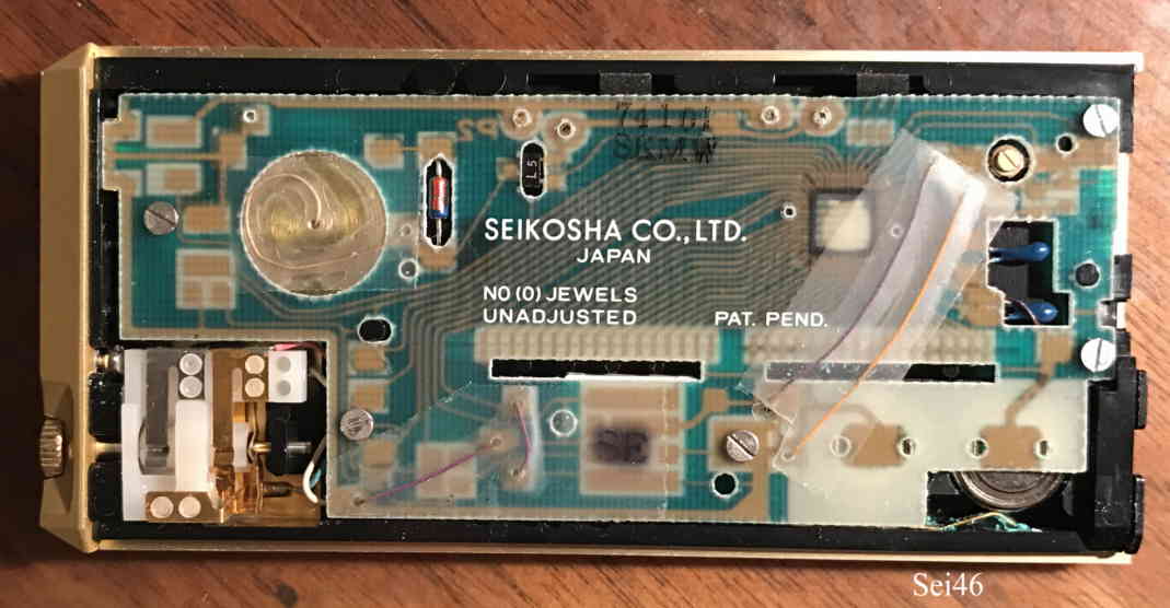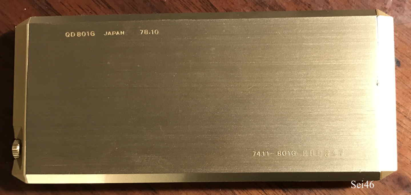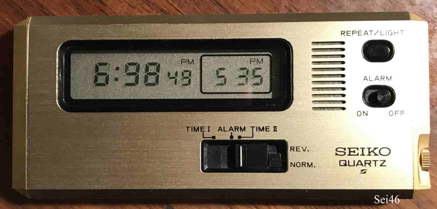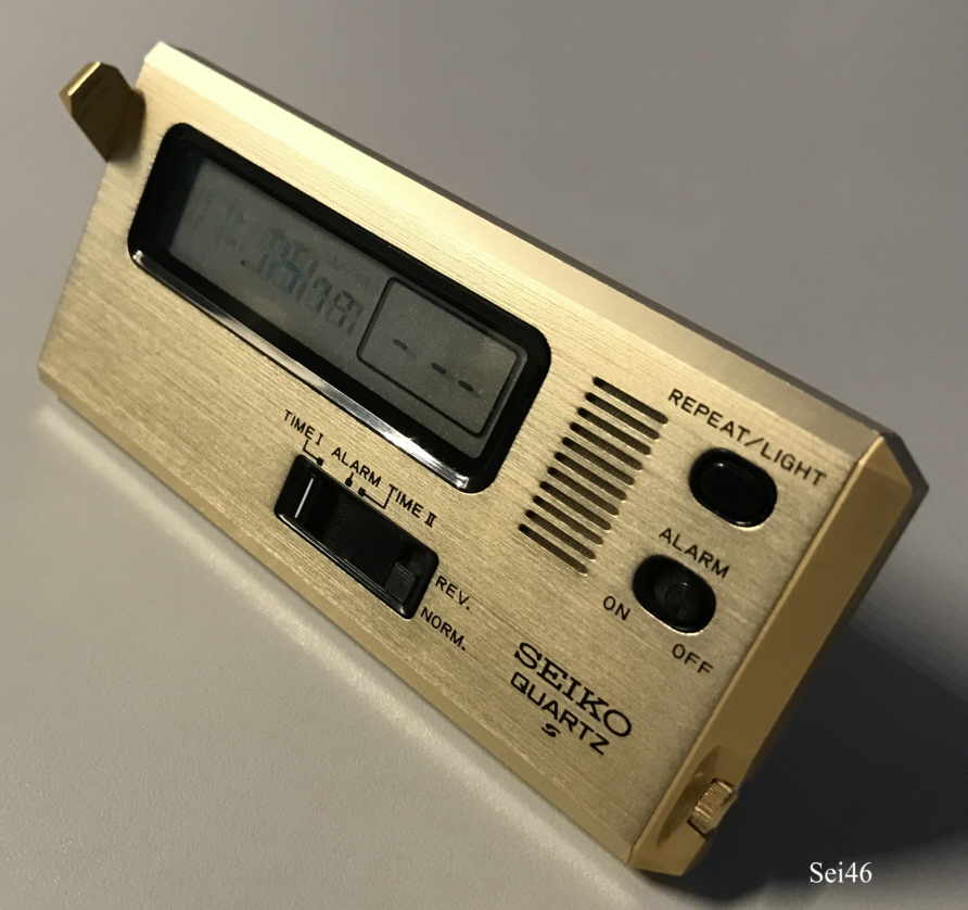 Ein schöner LCD Reisewecker von Seiko mit silbernem Aluminium Gehäuse und seitlichem Aufstellbügel. Auf dem Display ist links die Tageszeit und rechts die Weckzeit zu erkennen. Rechts neben dem Display ist der Lautsprecher für das Wecksignal. Daneben die Tasten für den Sleep Timer/ Licht, darunter der Alarm Schalter. Beschriftet vorn: “Seiko Quartz”, hinten: “QD 801 G, Japan, 78.10, 7411-801G 800247”, innen: “Seikosha Co. LTD, Japan, No 0 Jewels, Unadjusted, Pat. Pend”.