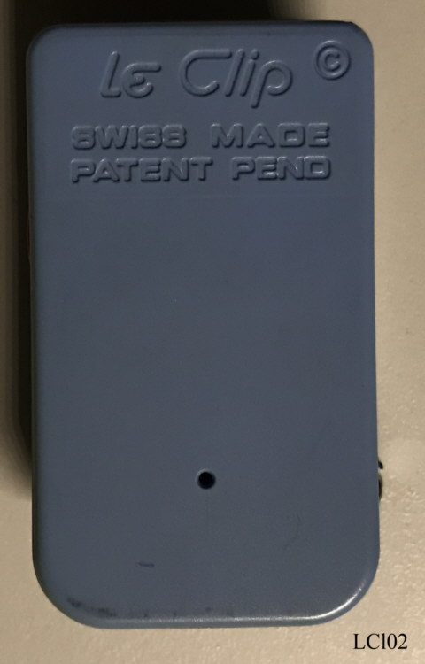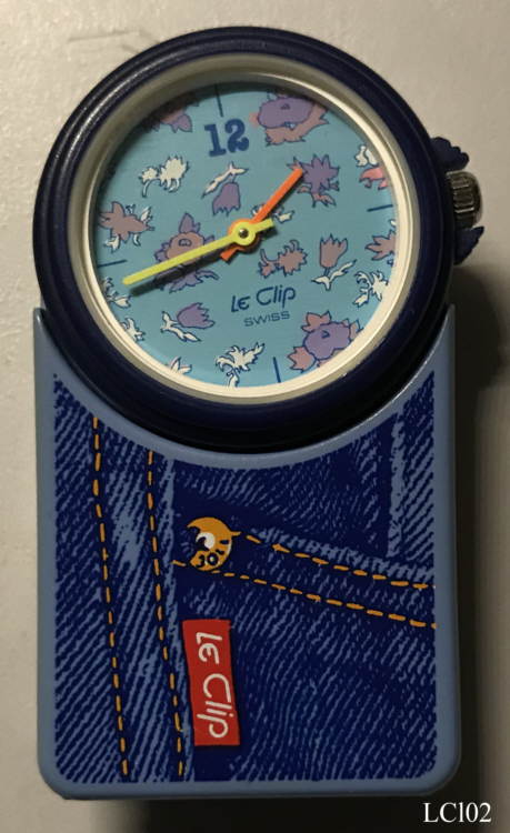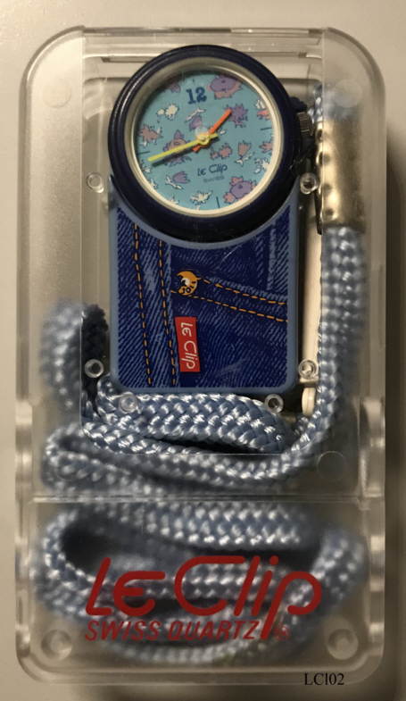 Eine interessante Quartzuhr der Marke Le Clip von Altop SA. Die Uhr kann in der Klammer um 180 Grad verdreht werden, sodaß man die Klammer in alle Richtungen nutzen kann. Gehäuse Kunststoff grau in Jeans Optik, Zifferblatt blau mit Ziffern aus stilisierten Natursymbolen. Beschriftung vorn: ”Le Clip, Swiss”, hinten: ”Le Clip, Swiss Quartz, Patent Pend.”, innen: ” Le Clip, Quartz”. Batteriewechsel nur von der Glasseite möglich.