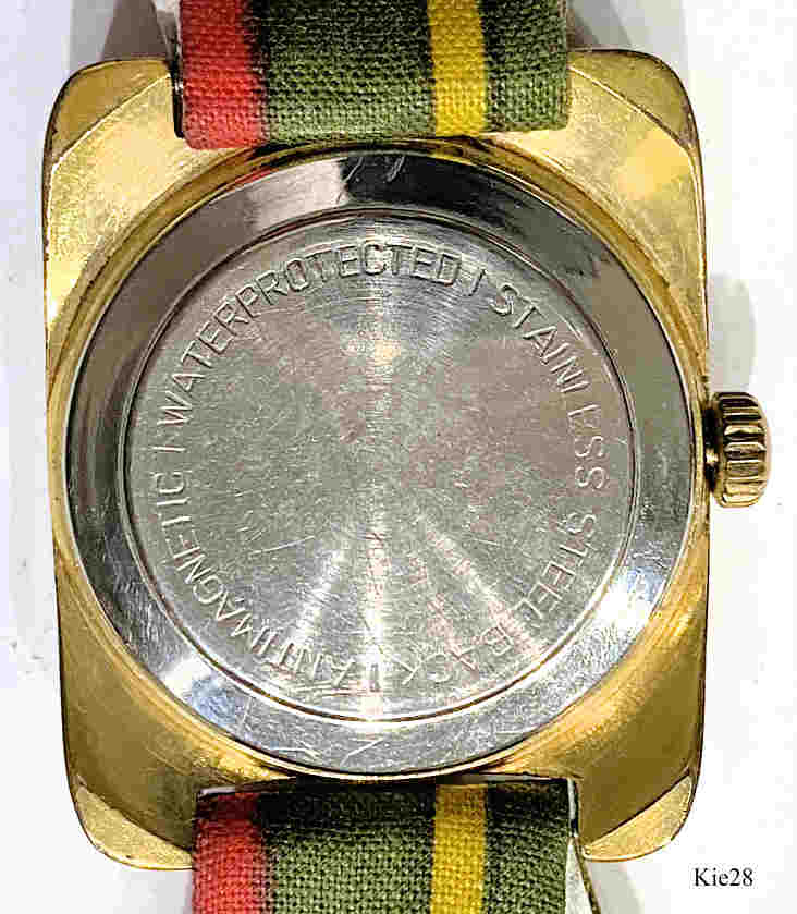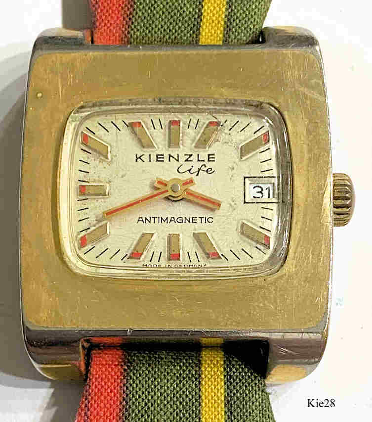 Dies ist eine Kienzle Life Damenuhr mit Handaufzugs Kaliber und Messing Gehäuse. Das Kaliber ist wohl 051 d 53. Beschriftet vorn: ”Kienzle Life, Antimagnetic”, hinten: “Stainless Steel Back, Waterprotected, Antimagnetic”, innen: ”Kienzle, Germany, No (0) Jewels, unadjusted, tw, 051d53”.