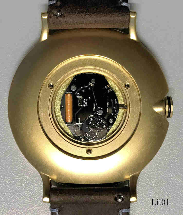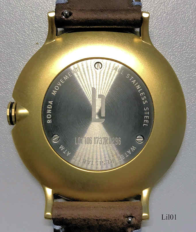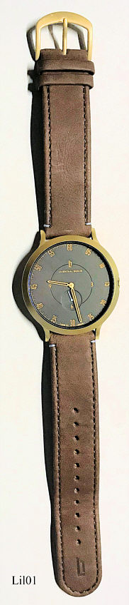 Die erste Uhr der Designfirma Lilienthal Berlin. Das Gehäuse ist aus Edelstahl. Beschriftung vorn: ”Lilienthal Berlin, Made in Germany “€, innen: “2 Two Jewels, Ronda, Swiss Parts, 1064”, hinten: ”Ronda Movement, All Stainless Steel, Water Resistant 5 ATM, L01 106 1737R 0296 ”€. Uhrwerk Kaliber Ronda 1064, Braunes Lederarmband. .