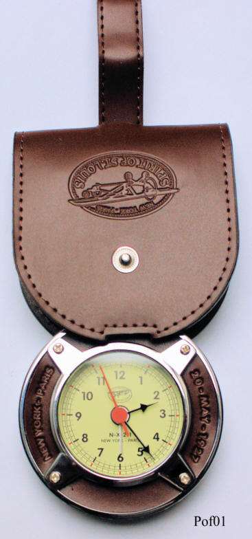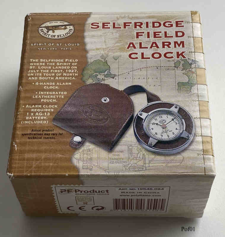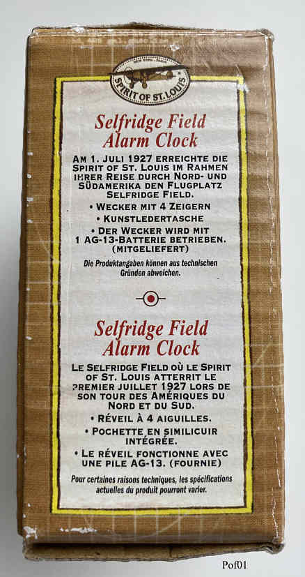 Am 1.07.1927 landete Lindbergh mit seinem Flugzeug “Spirit of St. Louis” auf seiner Nord- und Südamerika Tour in Selfridge Field. Zum Andenken daran wurde ihm ein Taschenwecker überreicht. Dies ist eine Quartz Nachbildung davon. Beschriftet vorn: “ Spirit of St. Louis, N-X-211, New York - Paris”. auf dem Leder: “ New York - Paris, 20. May 1927”, Kaliber DVD 3386A ”