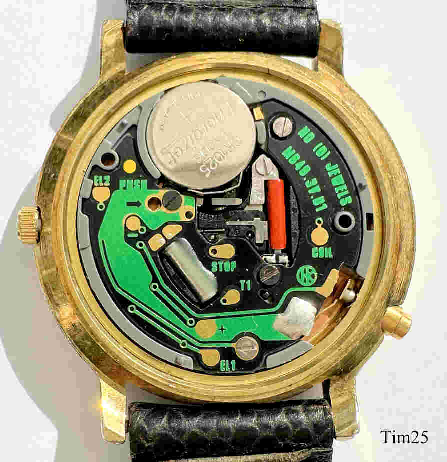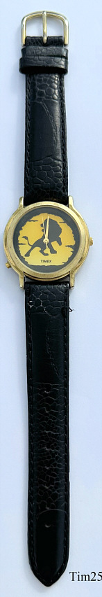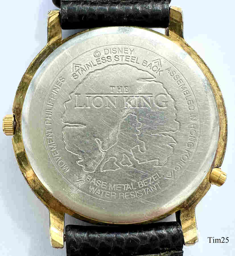 Dies ist eine Timex Indiglo Uhr zum Musical “The Lion King”. Beschriftet vorn: ”Timex”. hinten: ”The Lion King, c.Disney, Stainless Steel Back, Movement Philippines, Assembled in Hong Kong, Base Metal Bezel, Water Resistant”. Innen: ”No (0) Jewels , 3V. 01, M549”. Bei Druck auf den Knopf bei 7,5 leuchtet der Löwen Hintergrundt grün auf und ist damit im Dunkeln sehr gut abzulesen.