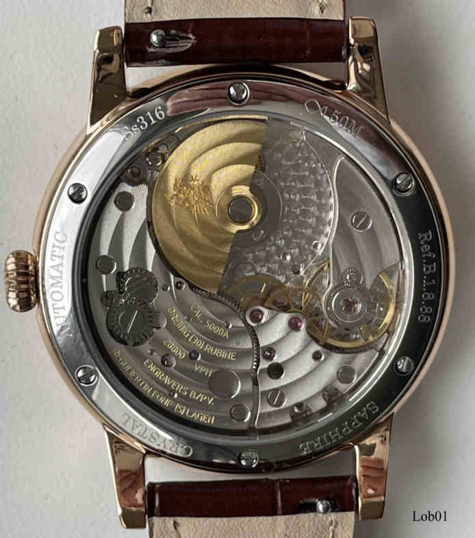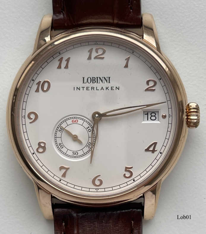 This Lobinni Automatic watch, model 1888 is driven by the first chinese developed micro rotor automatic movement, Hangzhou 5000A. The stainless steel case is red gold coated. Signed front: ”Lobinni, Interlaken”, back: ”Ref. B.1.8.88, Sapphire Crystal, Automatic, Ss316, 50M”, inside: ”Cal. 5000A, dreißig (30) Rubine, 28600 VPH, Engravers B/PV, Reguliert in fünf (5) Lagen”. Seconds scale between 7 and 8, calendar at 3. Brown leather band with red goldplated butterfly clasp.