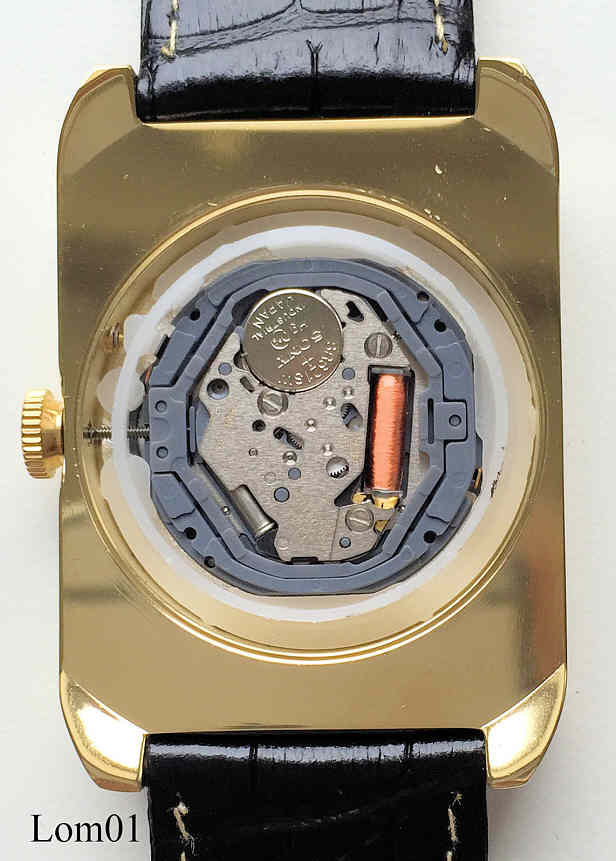 A beautiful dresswatch of Lombard&Cie with Kalendar and Moonphase,The windows at 10 show the day, at 2 shows the month and the golden pointer shows the date, the moonphase is displayed at 6. Golden base Metal case. Signed front: “Lombard&Cie, Original, Hand Made”, inside:”6P80, Miyota Co., No Jewels”, back: “Lombard&Cie, Water Resistant, Quartz, Stainless Steel Case Back”. Movement Caliber Miyota 6P80. Black leather band