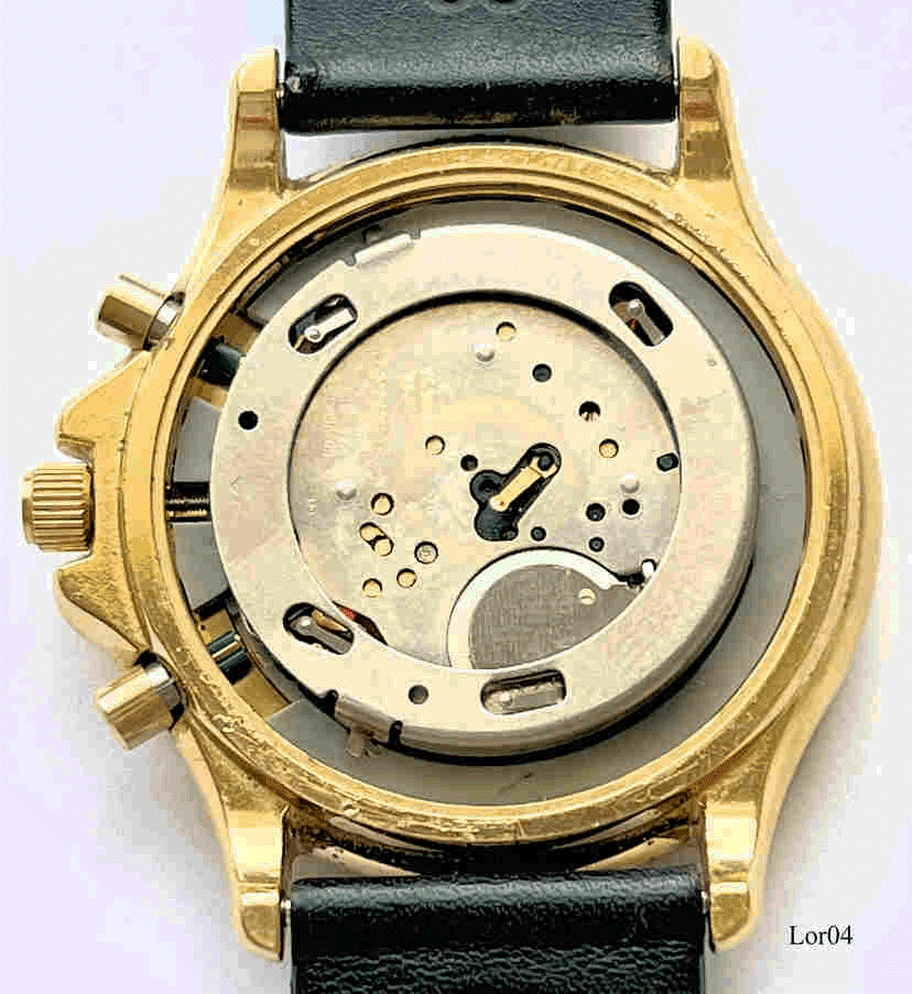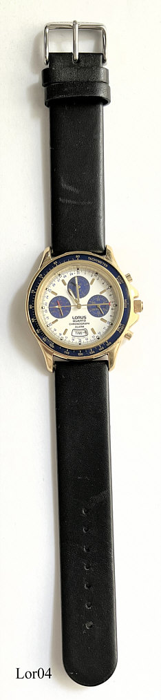 Dies ist ein Lorus Quartz Chronograph vier Funktionen: Zeit, Alarm, Chrono, Timer. Beschriftung vorn:” LORUS, Quartz, Chronograph, Alarm”, hinten:” Water resistant, 5 Bar, Base Metal Bezel, Stainless Steel Back, N945-7A10 AO“ Base Metal Gehäuse mit Edelstahl Boden und schwarzem Lederarmband. Kaliber Shiojiri N945A, Kalender über Zeigeranzeige am blauen Halbmond