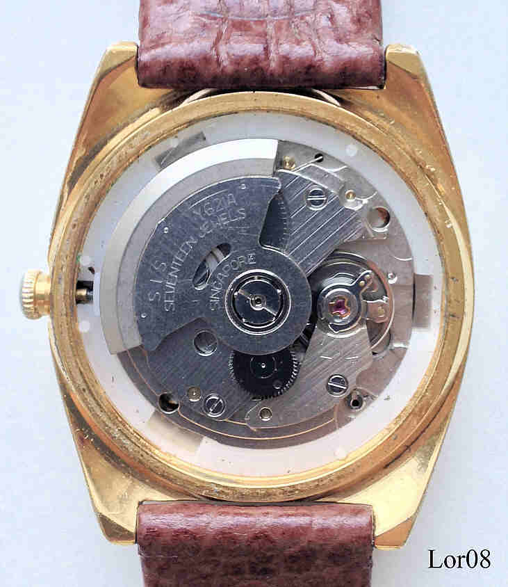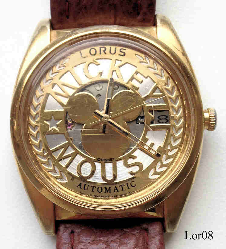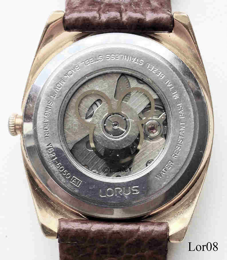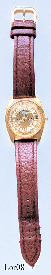 Eine Lorus Mickey Mouse Automatic Uhr im Auftrag von Walt Disney mit einem braunen Lederarmband. Beschriftet vorne: ”Lorus, Automatic, Mov’t Singapore, Y621-6070 R 2” hinten: “Water Resistant, Base Metal Bezel, Stainless Steel Back, Mov’t Singapore, Y621-6070, c Disney”, innen: “SIS, Y621A, Seventeen Jewels, Singapore”