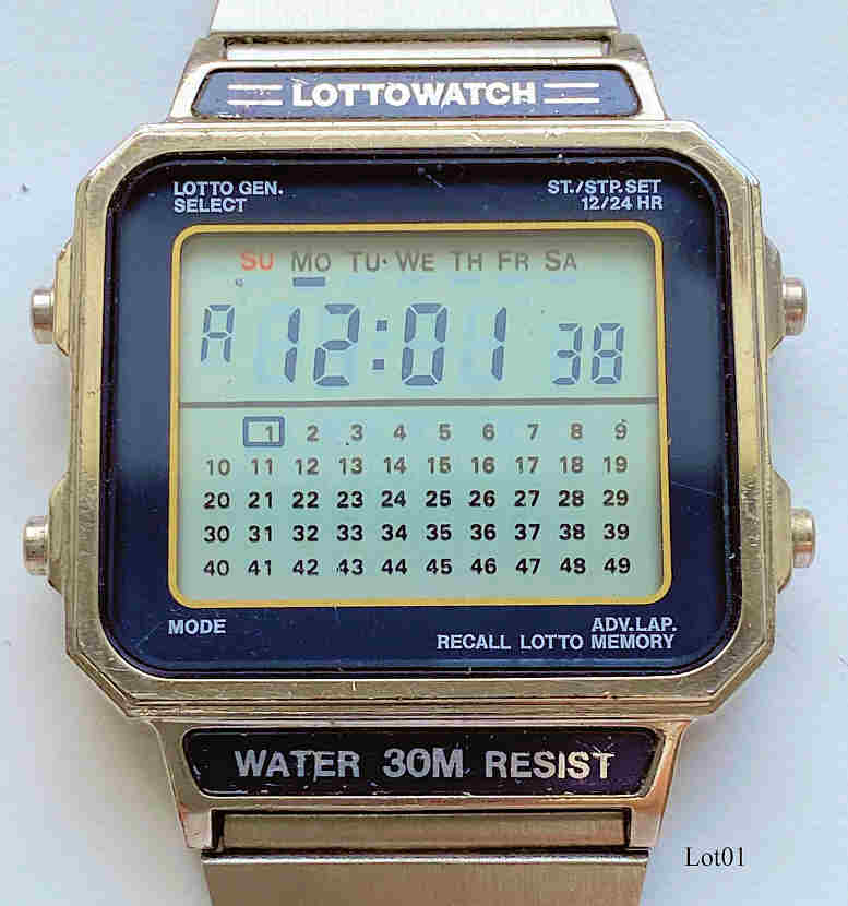 Eine Lottouhr unbekannter Herkunft mit der Sonderfunktion Zufallsgenerator für Lottozahlen. Einstellbar ist die Auswahl x aus y, wobei y maximal 49 ist, x ist 1-9. Beschriftet vorn: ”Lottowatch, Water 30M Resist”, hinten: ”WL703, Lithium CR2016, Water Resistant, Stainless Steel Back”, innen: “WL703,VDD”. Funktionen: Uhr, Stoppuhr, Lottogenerator. Metall Gehäuse mit Edelstahl Armband.