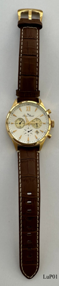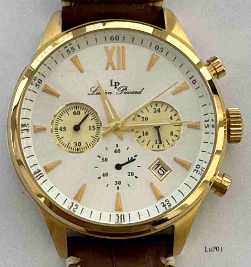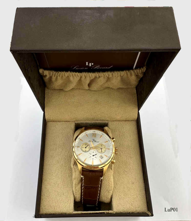 Ein Chronograph der Marke Lucien Picard. Beschriftet vorn: “LP, Lucien Picard”, hinten: ”LP, Lucien Picard, 28012C, Japan Made Movement, Mineral Crystal, All Stainless Steel, Water Resistant 5 ATM/165 Feet ”, innen: “SIIO, no Jewels, Japan, VD53C” . Das Werk ist ein SIIO VD53C, Datum bei der “4:30”, Braunes Leder Armband.