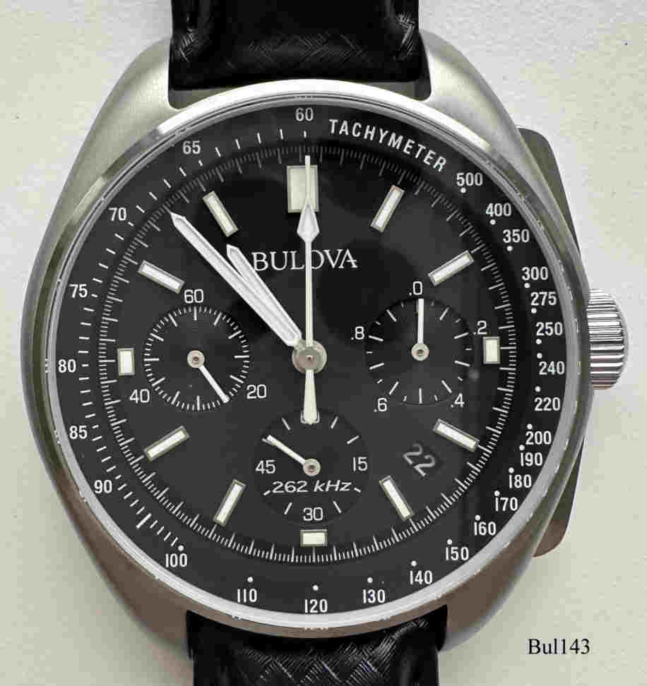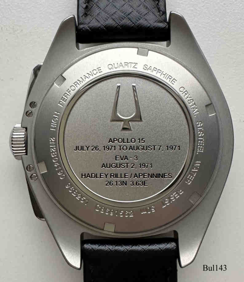 Dies ist ein Nachbau der Uhr die Dave Scott auf der Apollo 15 Mission auf dem Mond getragen hat. Die original Uhr wurde für 1,6 Mio US$ in einer Auktion verkauft. Der Nachbau ist ein Bulova Accutron II Chronograph mit Precisionist Werk, bei dem sich der Sekundenzeiger kontinuierlich bewegt. Beschriftet vorne: ”¯Bulova, 262 KHz”¯, hinten: ”High Performance Quartz, Sapphire Crystal, St.Steel, Water Resist 50M, 2N2B04190, 96B251, C8691562, Apollo 15, Juli 26.1971 to August 7, 1971,EVA-3, August 2, 1971, Headley Rille, Appenines, 26.13N, 363.E”,¯ innen: ”Japan, Bulova, 8730, No Jewels”¯. Movement 8730 Precisionist, Edelstahl Gehäuse, schwarzes Lederarmband und graues Velcro Band.