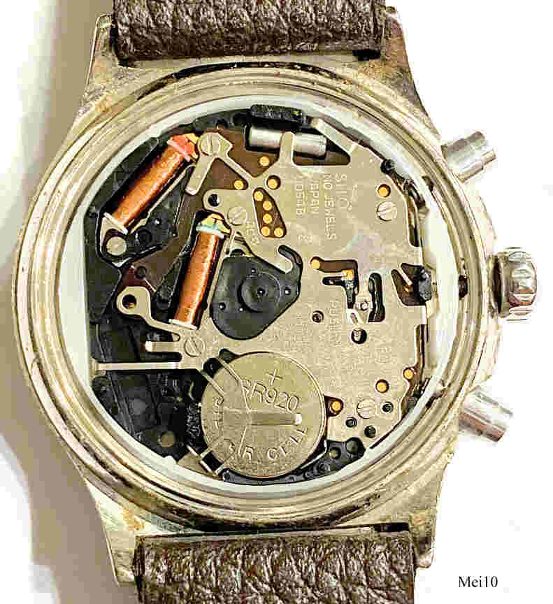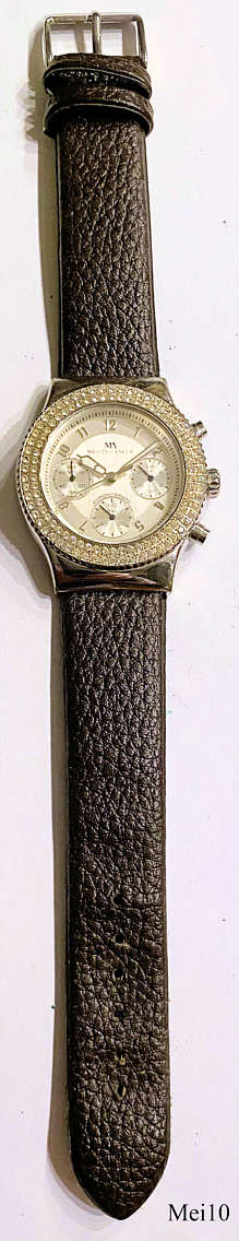 Ein Damen Chronograph mit einem doppelten Schmuckstein Rand der Marke Meister-Anker mit Quartzwerk. Das Gehäuse ist aus Base Metal. Beschriftung vorn: “MA, Meister Anker, Chronograph”, innen: ”SIIO, No Jewels, Japan, VD54B”, hinten: “Stainless Steel Back, Water Resistant, MA, Meister Anker, 707.006, 3/259”. Uhrwerk Kaliber SIIO VD54B.