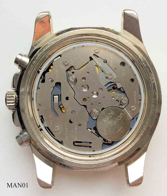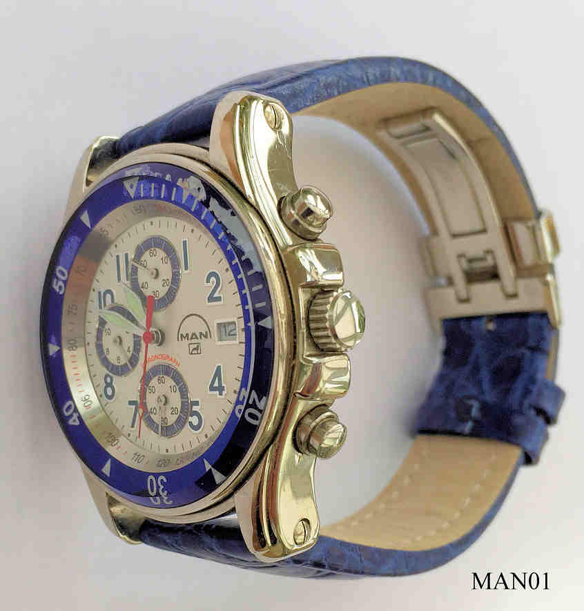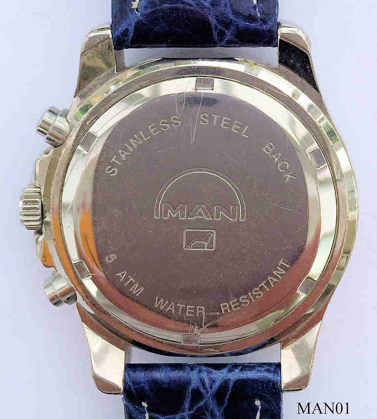 Ein Quartz Chronograph der Firma MAN mit weißem Zifferblatt, blauem Ring, verchromtem Gehäuse und Edelstahl Rückdeckel. Beschriftet vorn: “MAN, Chronograph”, hinten: ”5 ATM Water Resistant, Stainless Steel back, MAN”, innen: “Miyota Co.,OS10, No 0 Jewels, Japan”, Werk Caliber Miyota OS10,