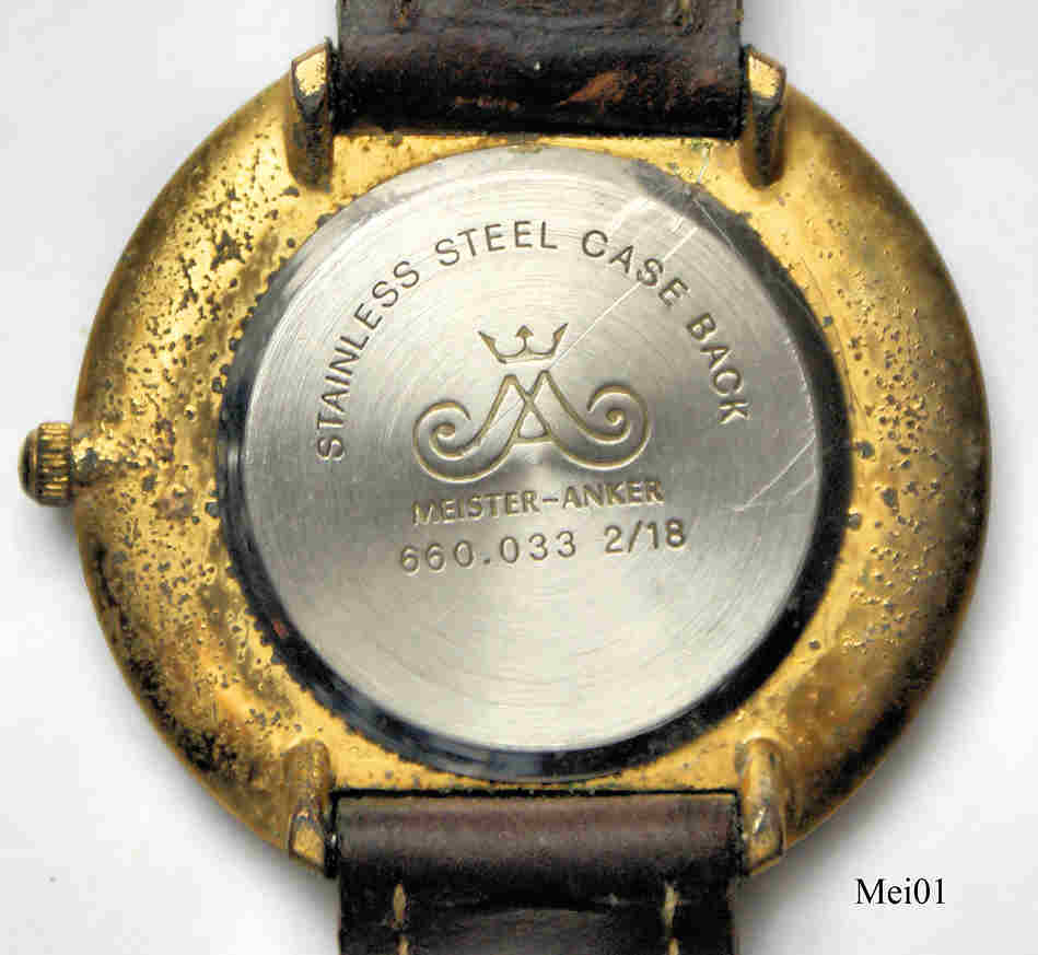 Eine sehr schöne Holzuhr der Firma Meister-Anker mit Quartzwerk. Das Gehäuse ist aus Base Metal, der Holzring ist aufgesetzt. Beschriftung vorn: “Meister Anker, Quartz”, innen: ”No 0 Jewels, 1, Y121E, Shiojiri Ltd. Japan”, hinten: “Stainless Steel Case Back, Meister Anker, 660.033, 2/18”.Uhrwerk Kaliber Shiojiri Y121E. Braunes Lederarmband