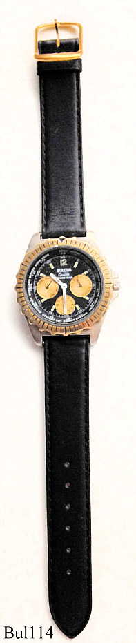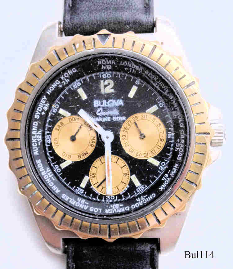 Eine Bulova Quartzuhr (kein Cronograph) Marine Star, Schwarzes Zifferblatt, goldene “Augen”. Anzeige bei 3: Datum, bei 6: Sekunde, bei 9: Tag. Beschriftet vorne: ”Bulova, Quartz, Marine Star”, hinten: “100 M, Marine Star, Special Made By Bulova, Swiss Made, 100 M, 11805, Marine Star” innen: ”Seven - 7 - Jewels, unadjusted, W. Germany, PUW 255”, Kaliber PUW 255.