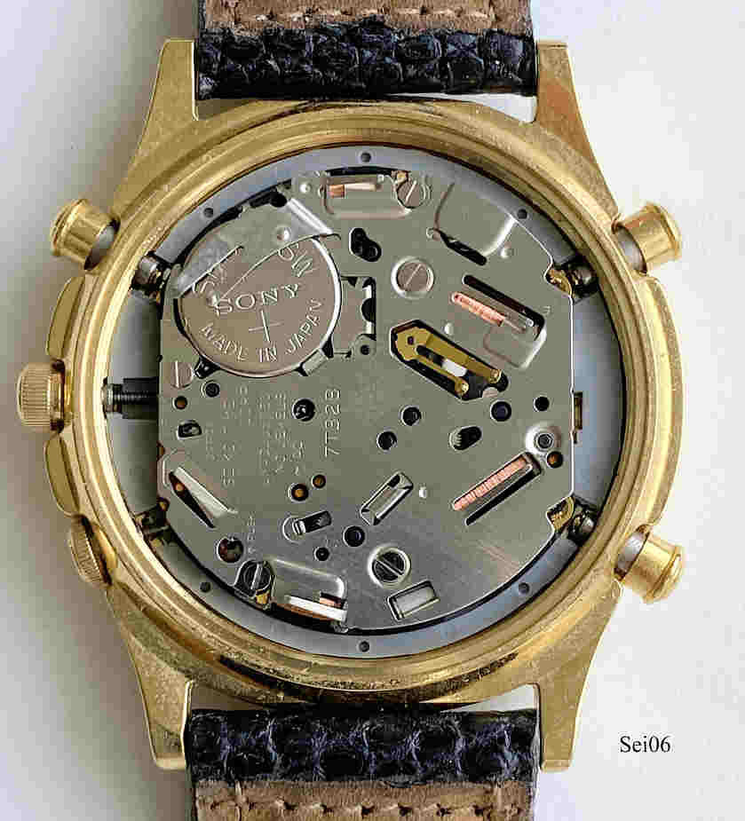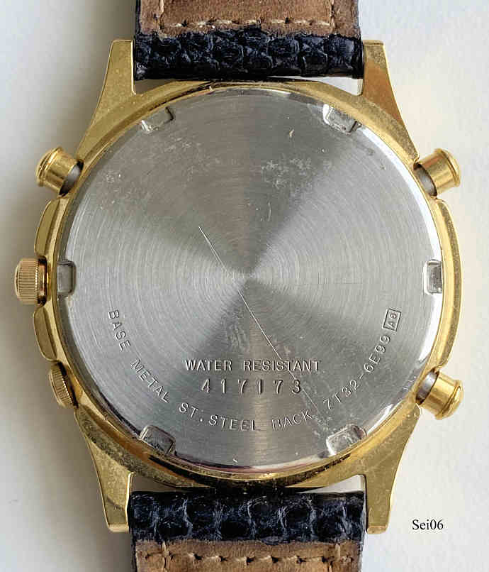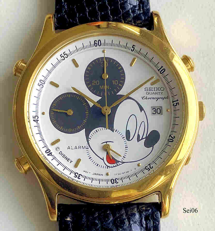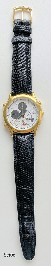 Ein Seiko Mickey Mouse Chronograph mit Base Metal Gehäuse und Stainless Steel Back. Kaliber Miyota 7T32, Datum bei der 3, Beschriftung vorn: “Seiko, Quartz, Chronograph, c Disney, Japan 7T32 6E99 A6”, hinten: “ Water Resistant, 417173, Base Metal, St.Steel Back, 7T32 - 6E99, A6”, innen: “Japan, Seiko Time Corp., Unadjusted, No Jewels, 7T32B”. Eidechsleder Armband in schwarz. Funktionen: Uhrzeit / Kalender, Alarm, Stoppuhr, zweite Zeitzone. Alarm Einstellung und zweite Zeitzone wird auf dem unteren kleinen Zifferblatt eingestellt, Stoppuhr bis 30 Minuten, der Zentral-Sekundenzeiger zeigt 1/10 Sekunde und das obere Zifferblatt die Minuten bis 30. Das mittlere Zifferblatt zeigt die Sekunden.
