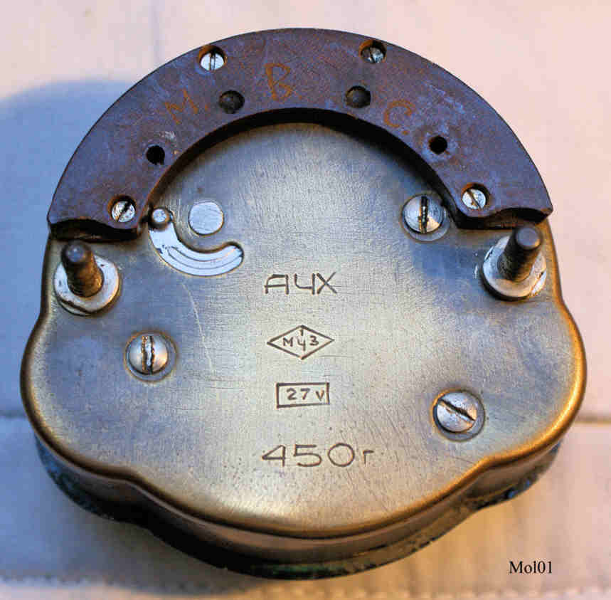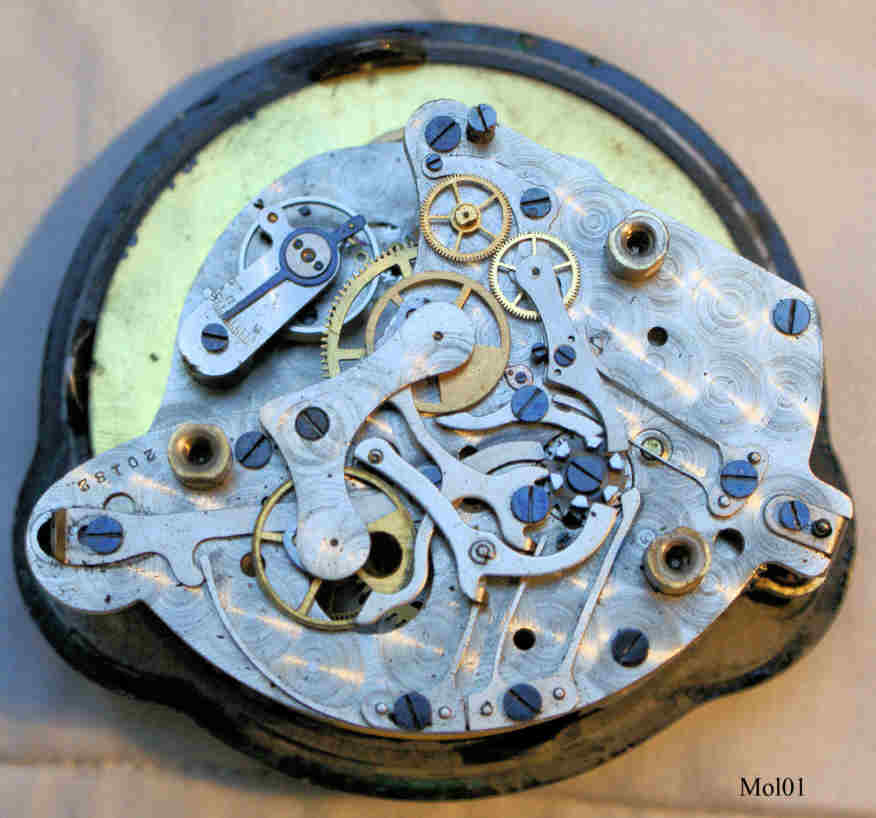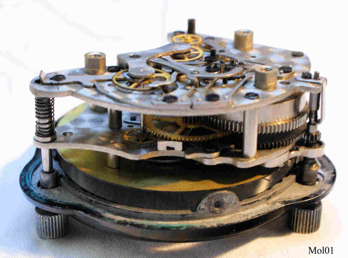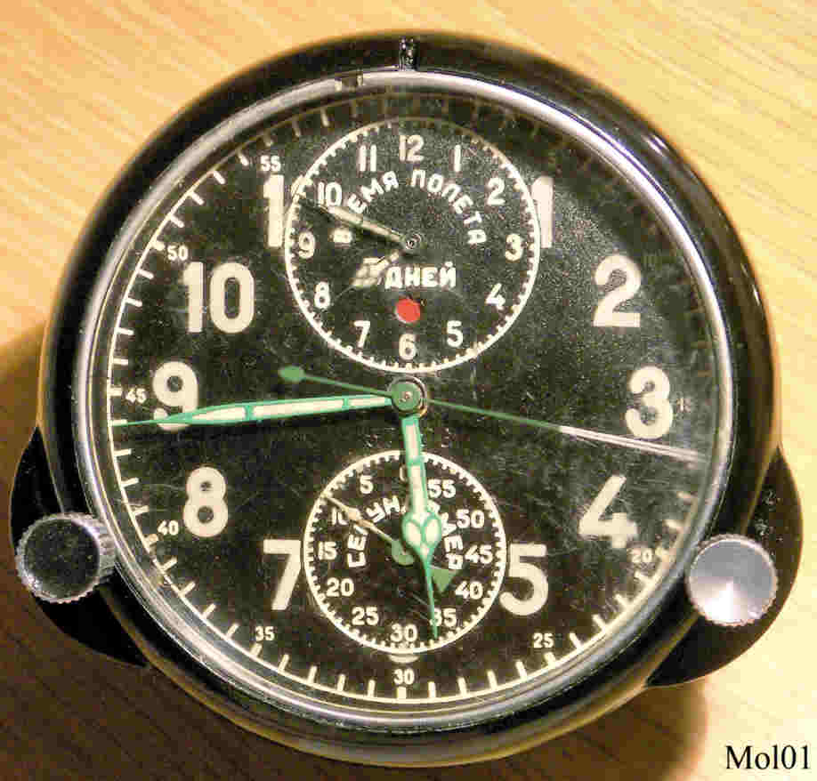 Ein Molnija AChS-1 Cockpit Chronograph, Hergestellt in den 1980er - 1990er Jahren. Diese Uhr ist für die schnellsten und am höchsten fliegenden Russischen Kampfjets bestimmt (MiG-23, MiG-25, MiG-29, SU-20 and SU-27). Sie ist konstruiert um auch bei Beschleunigungen von 6 G problemlos die genaue Zeit zu halten und übersteht Geschwindigkeiten von Mach 3 / 1800 mph und Höhen bis zu 100 000 Fuß. Eine eingebaute 27 V Heizung stellt die Funktion auch bei -60° C sicher. Das Zifferblatt ist mit Leuchtfarbe beschriftet, um gute Lesbarkeit auch bei Dunkelheit zu gewährleisten. Mechanische Handaufzugsuhr, es wird keine externe Kraftquelle benötigt, aufgezogen wird an der linken Krone. Es ist ein Multifunktions 2 Tages Chronometer mit Heizung, hergestellt in der Fabrik in Tcshelabinsk. Die Russische Air Force benutzt ein Basisdesign für alle Flugzeuge, einige Modelle werden für die schnellsten MIGs, andere für einfache Propellerflugzeuge genutzt. Diese Uhr hat ein Federzug 2 Tages Werk. Die obere Anzeige zeigt die Flugzeit, gestartet durch Druck auf die linke Krone. Die rechte Krone startet, stoppt und resettet den Sekundenzeiger und die untere Minutenskala. Das kleine runde Fenster in der oberen Skala zeigt den Betriebszustand der Flugzeitskala an und wird durch Drücken der linken Krone betätigt. Die Beschriftung oben heißt “Flugzeit” Mechanisches zwei Tages Präzisions Uhrwerk mit 25 Steinen, Wasserdicht und Stoßsicheres Metallgehäuse ca 80 mm Durchmesser und 80 mm hoch.