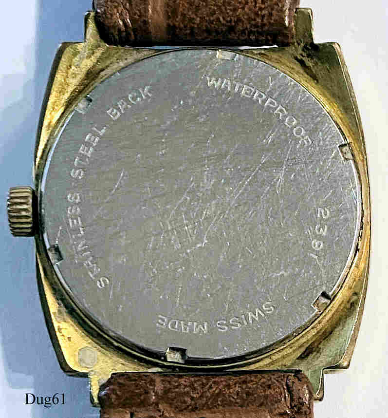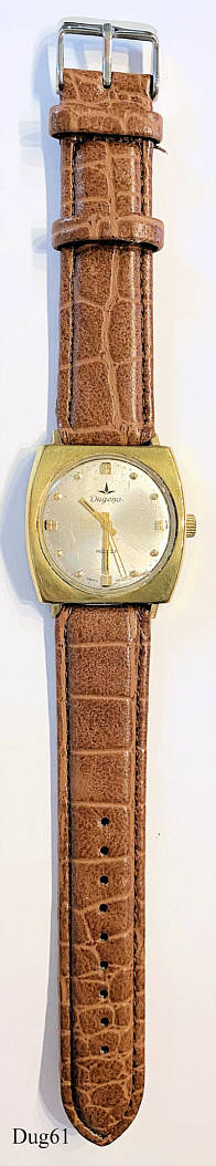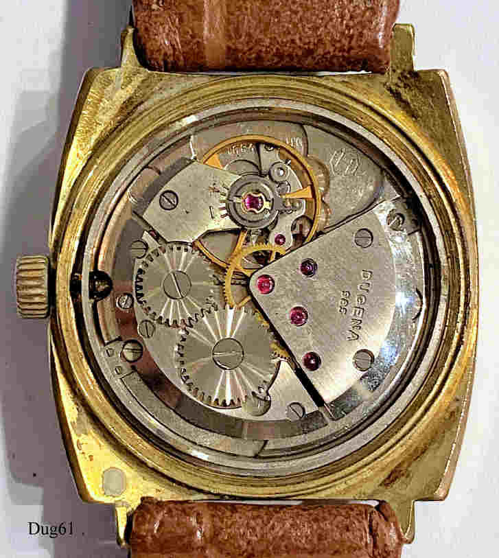 Eine Dugena Monza Handaufzugsuhr mit vergoldetem Gehäuse und Edelstahl Boden. Kaliber Dugena 985, Beschriftung vorn: “Dugena, Monza, Swiss Made”, hinten: ”2391, Swiss Made, Stainless Steel Back, Waterproof”, innen: ”Dugena, 985, DH 2391 ETA”. Braunes Lederarmband mit neutraler Schließe.
