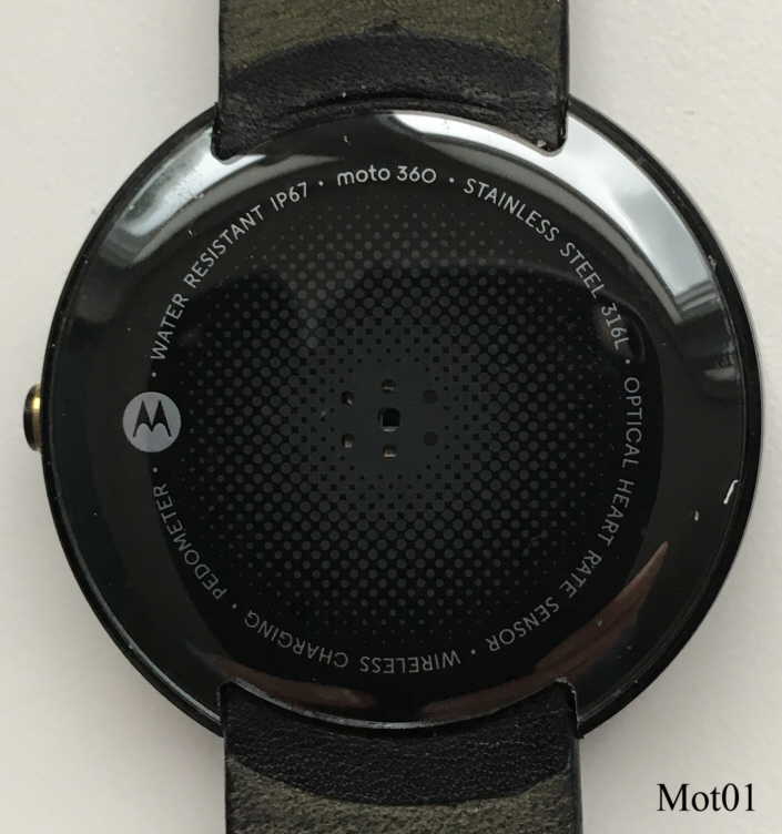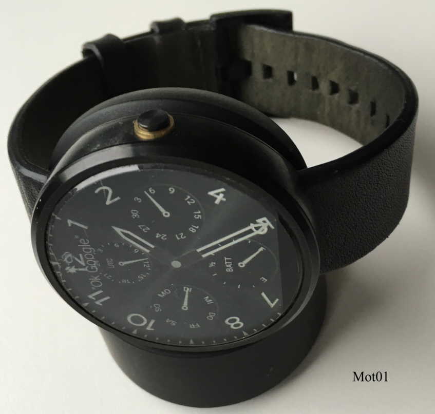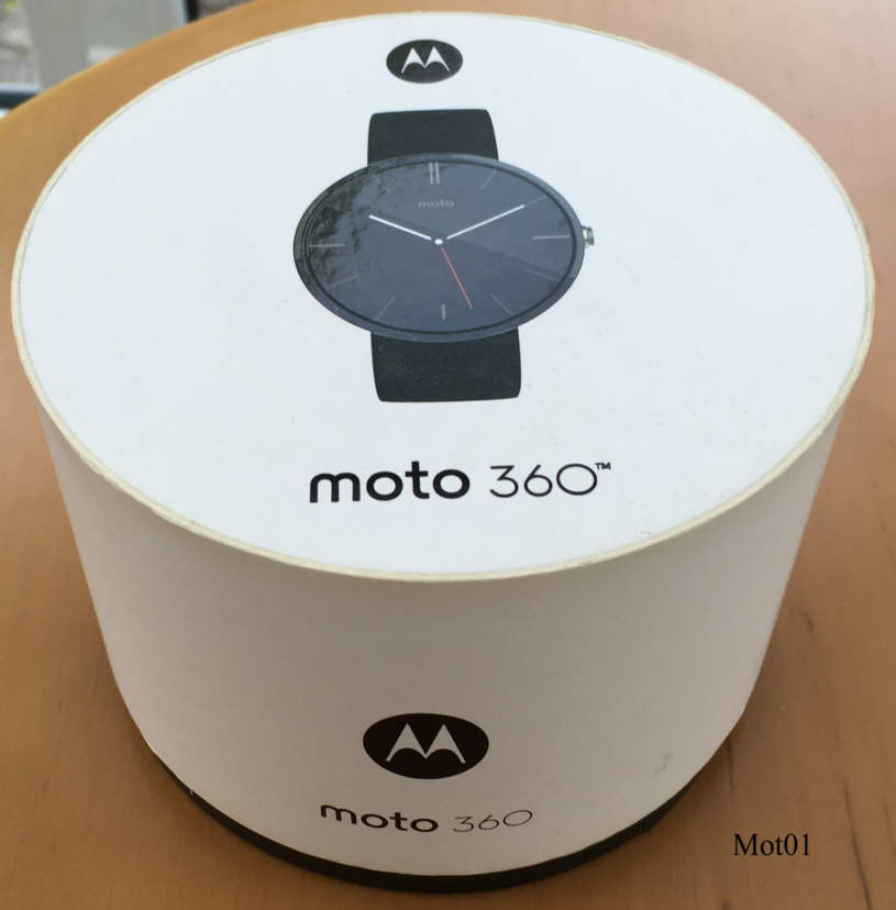 Die Moto360 Modell 1 von Motorola kann über Bluetooth mit Android Telefonen gekoppelt werden. Die Uhr hat einige eigenständige Funktionen und  funktioniert auch als Fernbedienung des Android Gerätes. Der Accu wird über ein induktives Ladegerät über die Rückseite geladen. Die Bedienung erfolgt über den Touchscreen der Uhr, die Uhranzeige wird über eine Handbewegung aktiviert. Angenehmes schwarzes Lederarmband. Die Zifferlätter der Uhr können über das Telefon geändert werden. Texas Instruments OMAP 3630 Processor