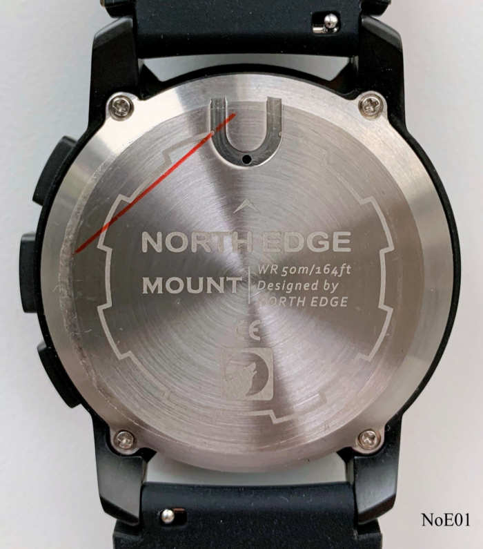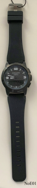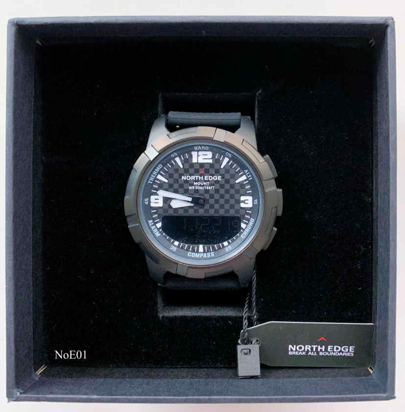 A North Edge multifunktion watch, Modell Mount. Stainless Steel case, signed front: ”North Edge, Mount, WR 50 M/164 Feet”, inside: “ ”, back: ”North Edge, Mount, WR 50 M / 164 ft, Designed by, North Edge”. At 6 an LCD Display to show the funktions. The watch has a Magnet-, Thermo- und Air pressure sensor, to handle following funktions: Air pressure (Meteo), Altitude (Alti), Temparature (Thermo),Compass (Compass), as well as Alarm, Chrono, Date and time. Selection of the funktions is done via the middle button, and circles the functions. The pointers show the selected function and the corresponding value is shown in the LCD. In the compass function the pointers set straight and the minute pointer points to the North, the hour pointer to theSouth€. This is a not so true copy of the Tissot T-Touch, without the sensitive Display.