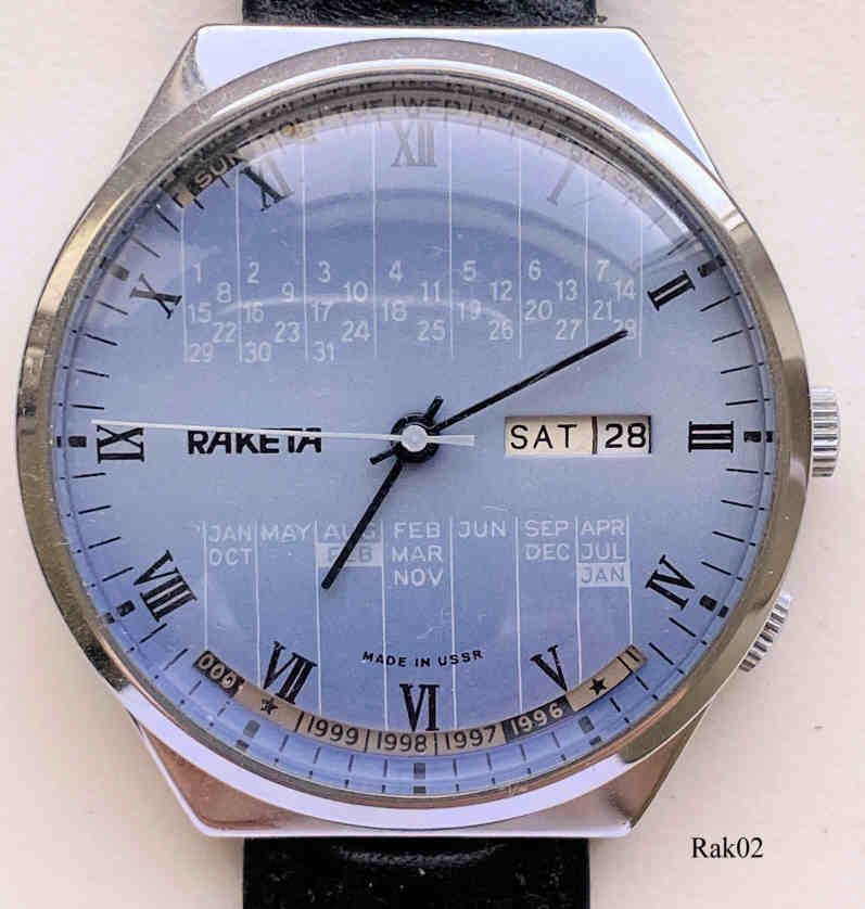 Dies ist eine Raketa Kalenderuhr, Caliber 2614. Beschriftung vorn: ”Raketa, Made in USSR”, Rückseite: ”366”, Bei der “6” ist die Jahreszahl auf den entsprechenden Monat einzustellen, entsprechend zeigt dann bei der “12” der Wochentag auf das jeweilige Datum. Edelstahl Gehäuse, gedrückter Boden, schwarzes Lederarmband.