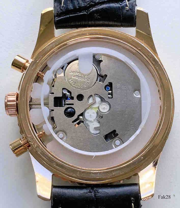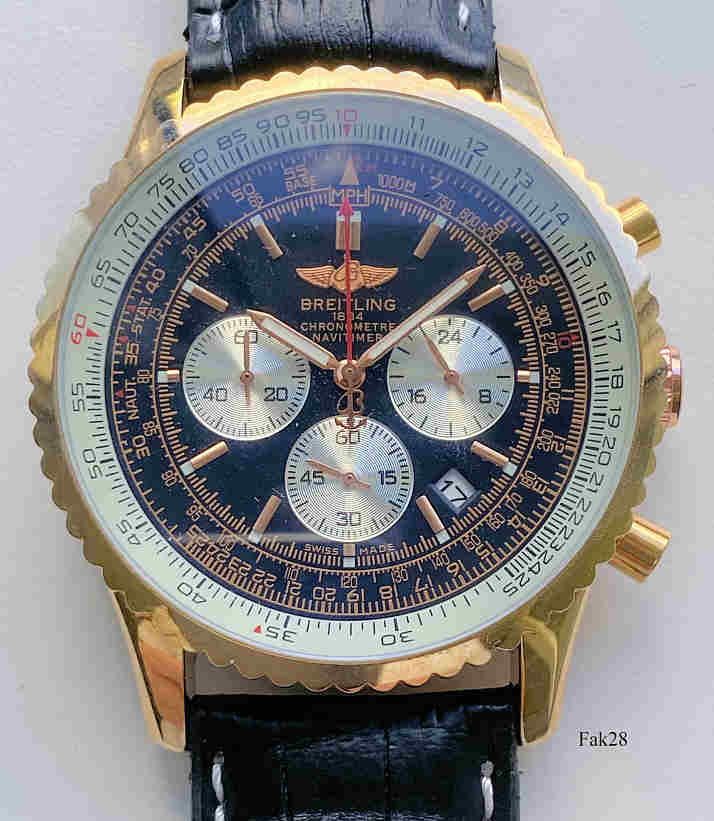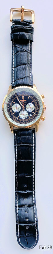Dies ist ein Nachbau der Breitling Navitimer. Beschriftet vorn: “Breitling, 1884, Chronometre, Navitimer”, hinten: “Breitling 1884, Chronographe Certifie, Chronometre Teste 3 Bars, A24332, 6886738”, innen: “Sunon, PE70, No Jewel, Unadjusted”. Schwarzes Lederarmband.
