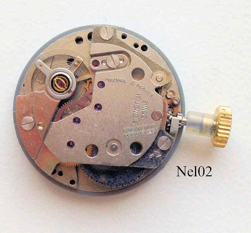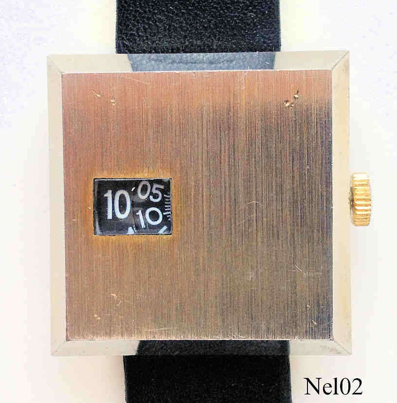 A mechanical Digital Nelson handwind watch. It is a normal Ebauches handwind movement, two discs are turning: Hour-, and minute disc. Signed front: ””, back: ”Nelson, 17 Jewels, Swiss Made, Stainless Steel Back, Base Metal Case”, inside: “Michael Z Berger, Swiss, 17 Jewels, Seventeen, Unadjusted, EB 8461”.