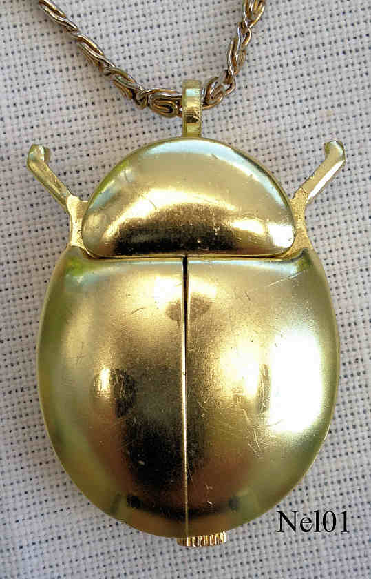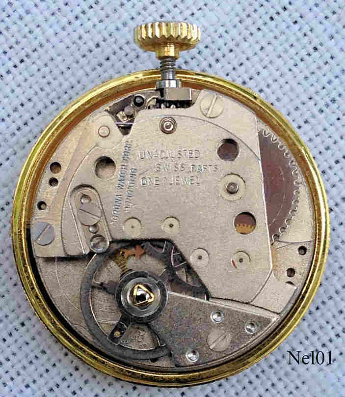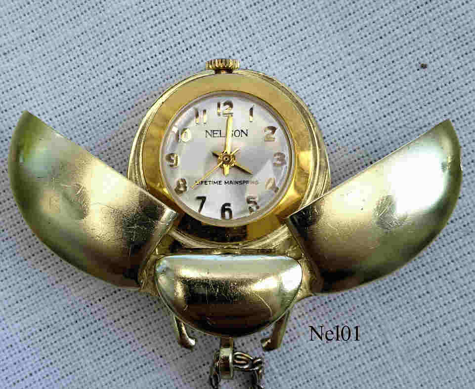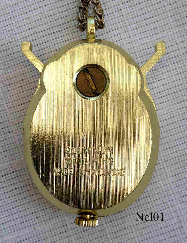 A simple handwind chainwatch in the shape of a scarabäus. Pressing on the feelers opens the wings and shows the watch. Signed front: ”Nelson, Lifetime Mainspring”, back: ”Aluminum, Hong Kong, Made in Hong Kong”, inside: “Corona Watch Co.,Unadjusted, Swiss Parts, One (1) Jewel”. Handwind movement from Ebauches S.A. 8461-74, case Aluminum. |