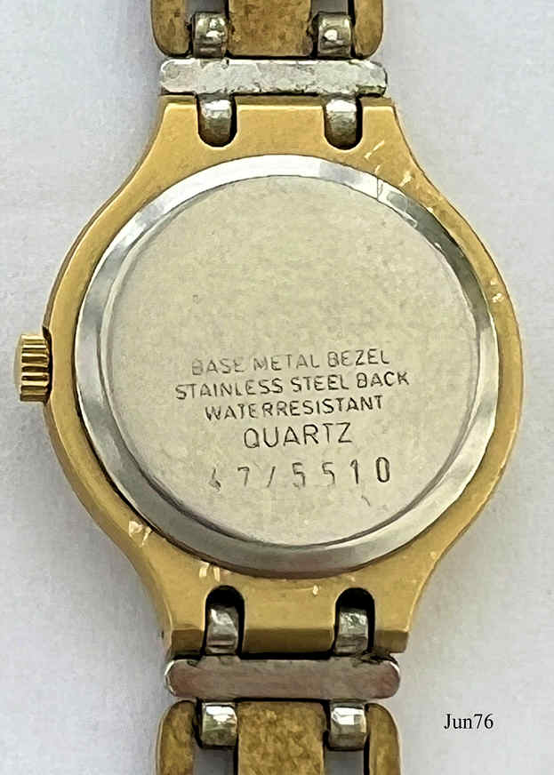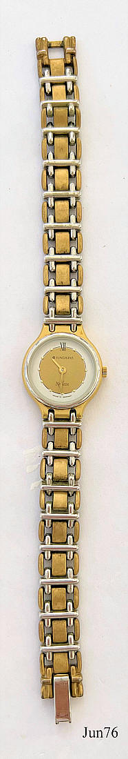 Eine Junghans Damen Schmuckuhr mit silbernen Punkten auf dem Zifferblatt, nur die zwölf ist mit römischer Ziffer bezeichnet. Dazu ein kunstvoll gearbeitetes Silber/Goldfarbiges Metallarmband. Beschriftet vorn: “Junghans, Noblesse, Made in Germany”, hinten: “Base Metal Bezel, Stainless Steel Back, Waterresistant, Quartz, 47/5510”, innen: “PUW, W.Germany, 510, Unadjusted, Four 4 Jewels”