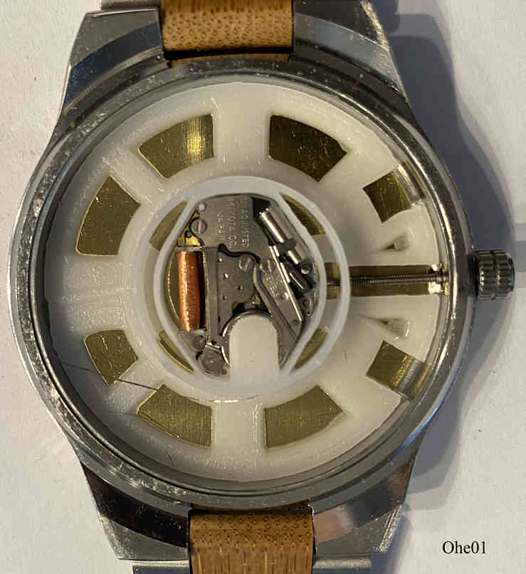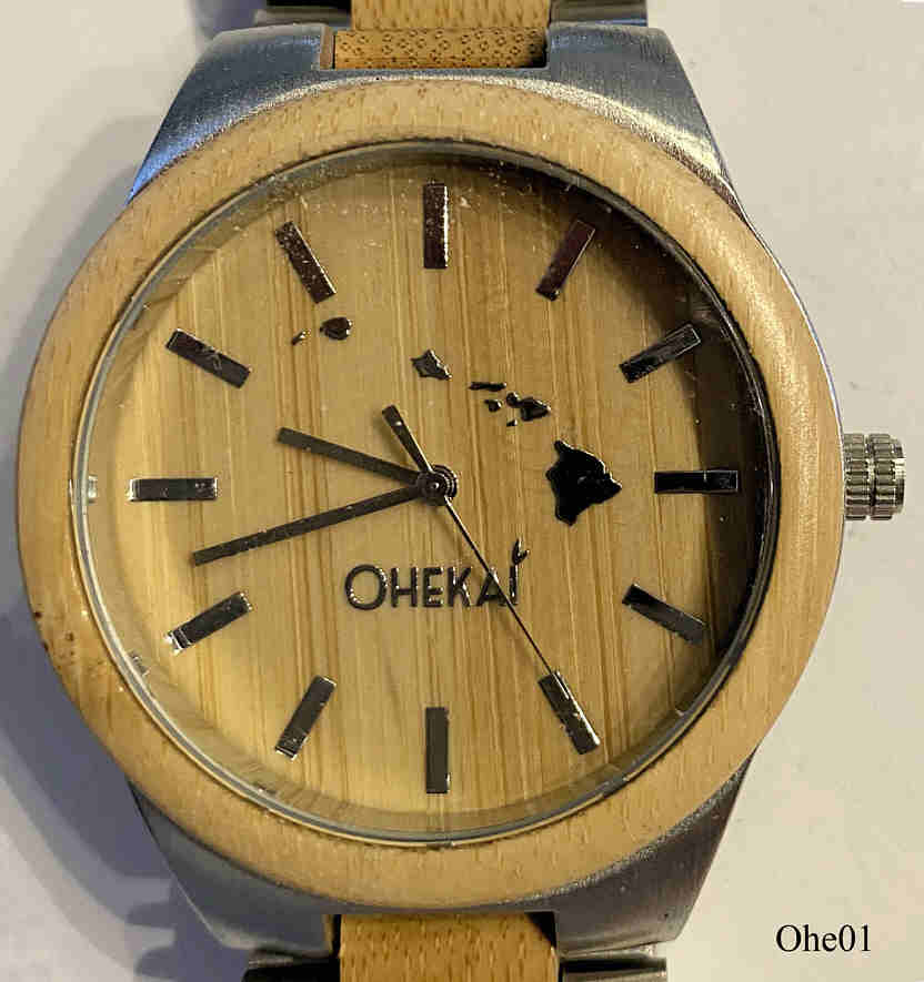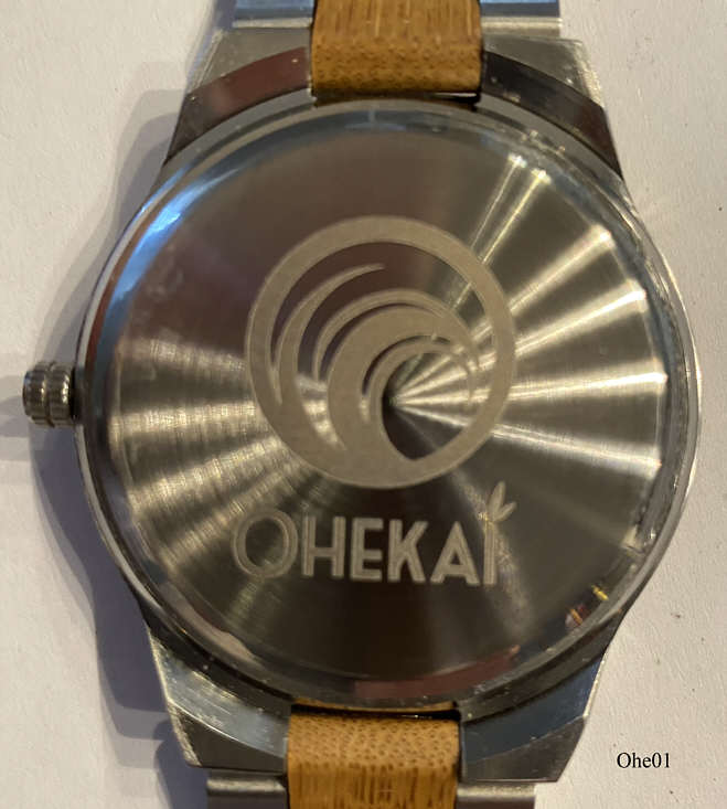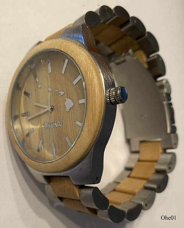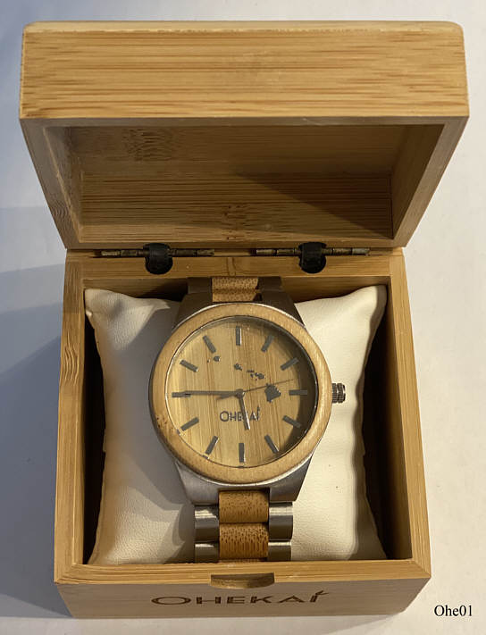 A beautiful woodwatch of Ohekai with quartz movement. The watch is producedin Hawaii with the contours of the Hawaiian Islands in stainless steel on the dial. It is Bambus wood, signed front:: “Ohekai”, inside: “Unadjusted, Miyota Co. Japan, No Jewels”, back: “Ohekai”. Band made of stainless Steel and Bambus. Movement Miyota. Bought in Hawaii 2020