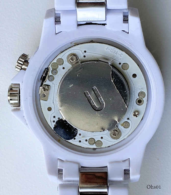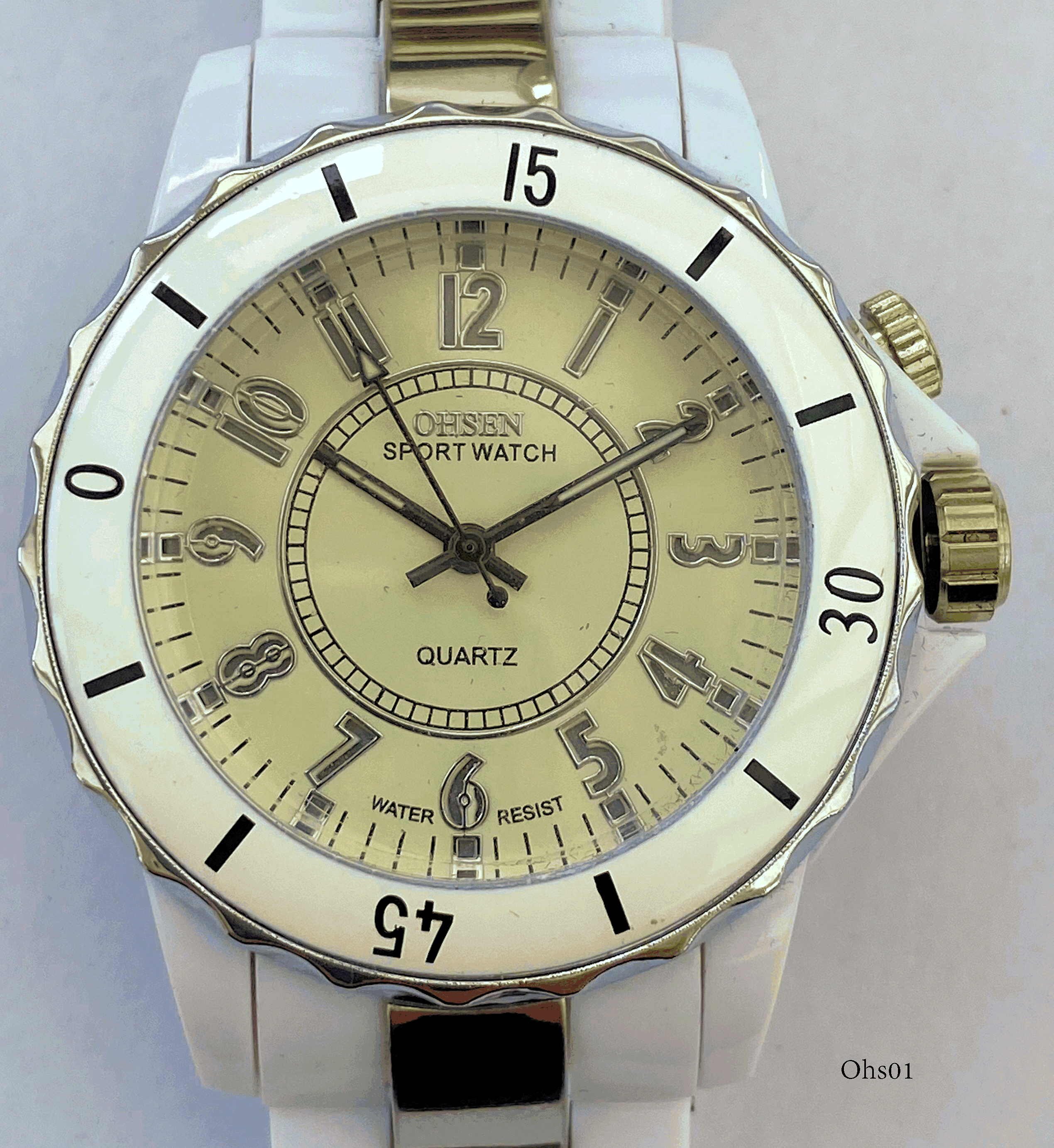 Eine Quartz Uhr aus China mit Kunststoff Gehäuse und Stainless Steel Back. Beschriftung vorn: ”Ohsen, Sportwatch, Quartz, Water Resist”, Rückseite: ”Stainless Steel Back, Water Resistant 3ATM, Ohsen, FG0786”, Weißes Kunststoff Gliederarmband. Die Uhr hat transparente Ziffern, durch Druck auf den Knopf bei der 2 werden die Ziffern von innen farbig beleuchtet. Elektronic J-129A-C