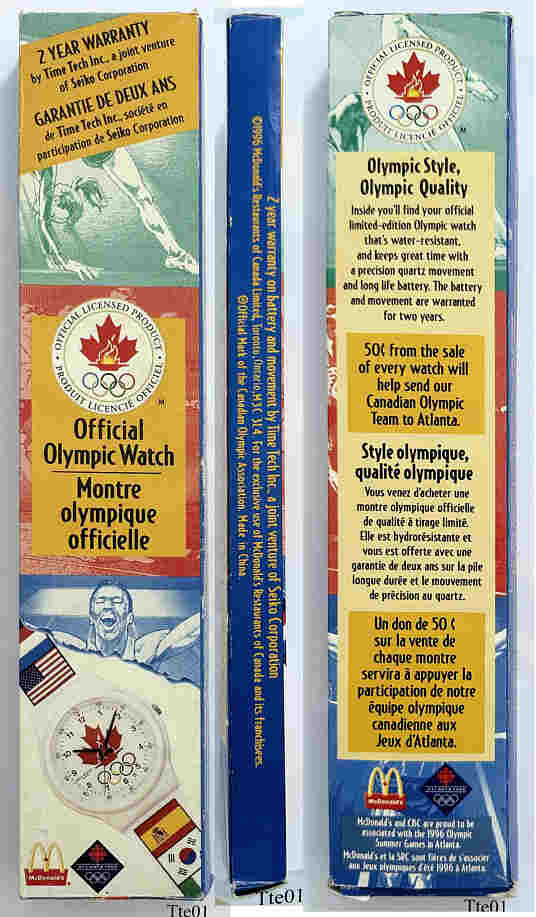 Eine Olympiauhr zur Sommerolympiade 1996 in Atlanta von McDonalds in in limited Edition, die Anzahl der Limitierung ist mir nicht bekannt. Beschriftet vorn: “Water Resistant, Quartz”, innen: “Morioka Tokai Co, PC21A, No Jewels”,hinten: “Original Licensed Product Limited Edition Series COA/A.O.C.”, weißes Kunststoff Armband, Kaliber Morioka Tokai PC21A.