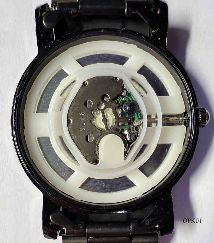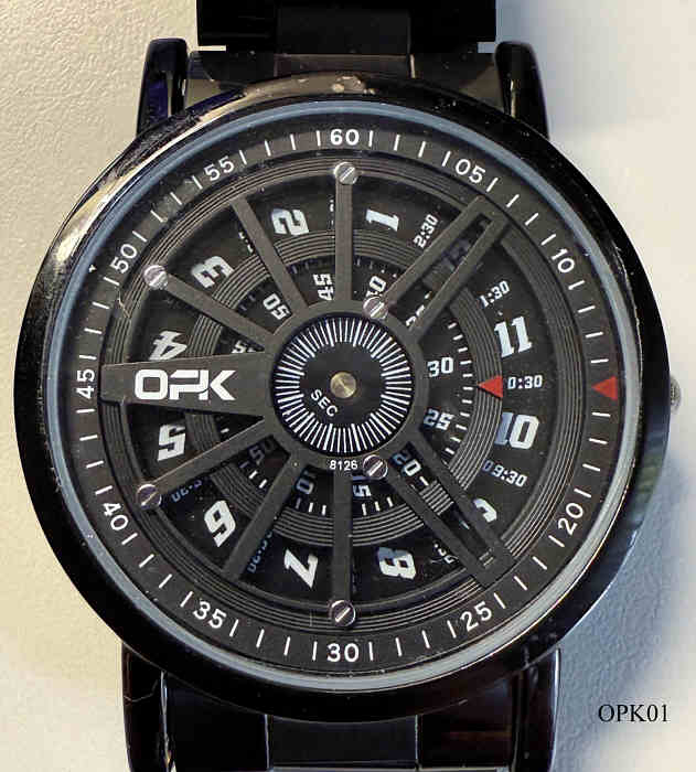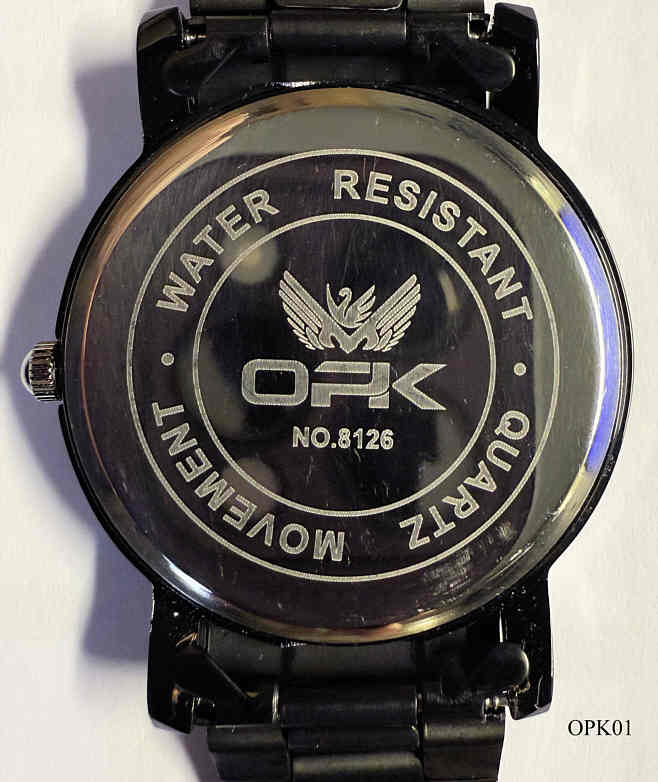 An Fun watch of a chinese (?) brand OPK The special dial shows the time at the position of the three.Signed front: “OPK”,Back: “Oukeshi, Stainless Steel Back: “OPK, Water Resistant, Quartz Movement, No.8126€, inside: ” OPK, Water Resistant, Quartz Movement, No.8126”, inside: “8975”, Black Stainless Steel case and black Stainless Steel band.€