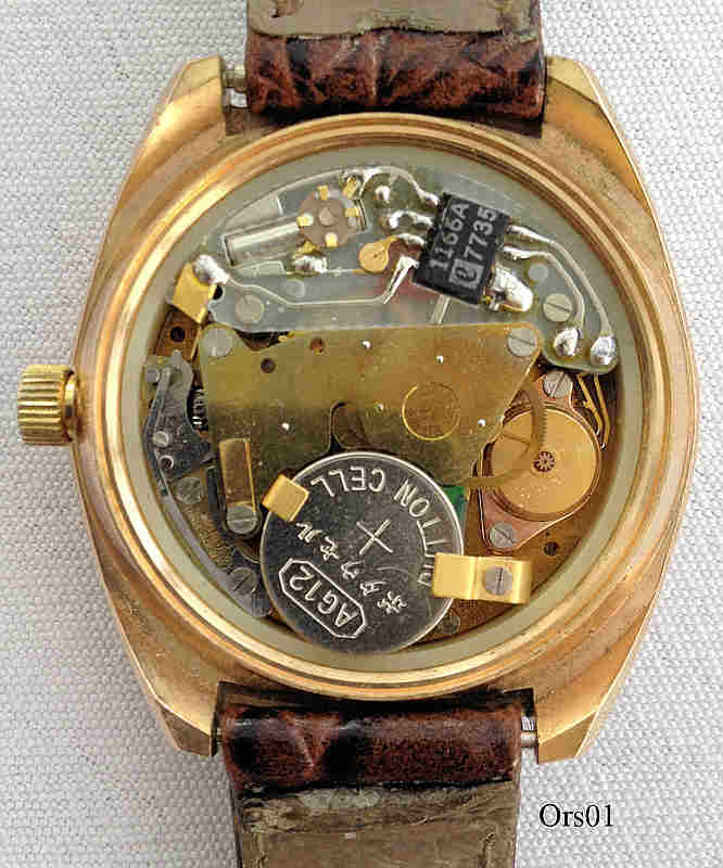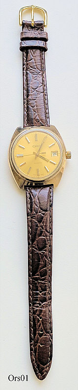 Eine Quartz Uhr der schweizer Marke Oris mit dem frühen Quartzwerk der SSiH Kaliber 5500. Base Metal Gehäuse und Stainless Steel Back. Beschriftung vorn:” Oris, Quartz, Swiss Made”, Rückseite:” Stainless Steel Back, Water Resistant, Shock Resistant, Oris Watch Co Swiss”, innen: “Unadjusted, Three 3 Jewels”, Braunes Lederarmband, Datum bei der 3.
