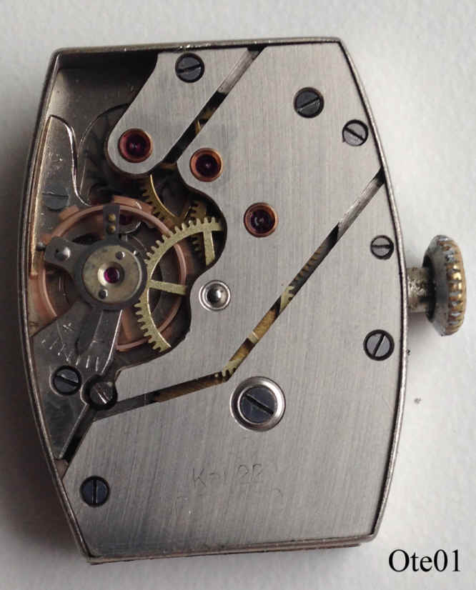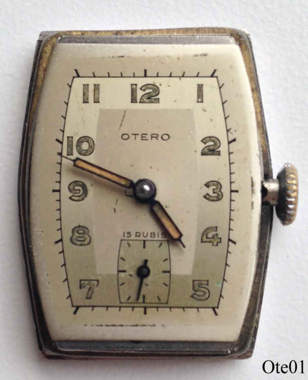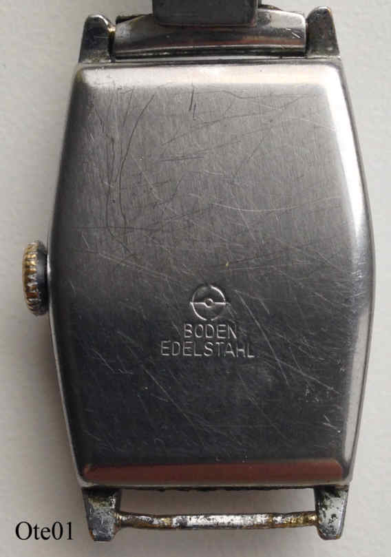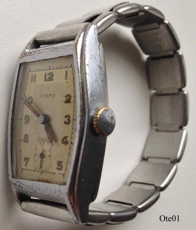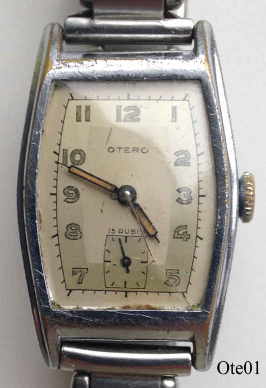 Dies ist eine Handaufzugsuhr von Otero, “Otero - Uhrenrohwerke Otto Epple, Königsbach”, Kaliber 22 mit 15 Steinen. Inschrift vorn: “Otero, 15 Rubis ”, hinten: “Boden Edelstahl”, innen: “Kal. 22, Otero”. Edelstahl Flexarmband “Kiefer, Expandro, Patent, Stainless Steel”