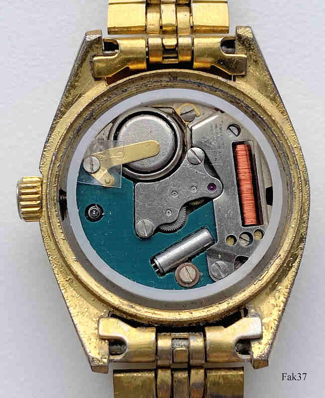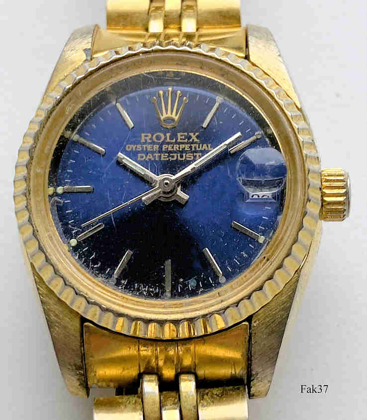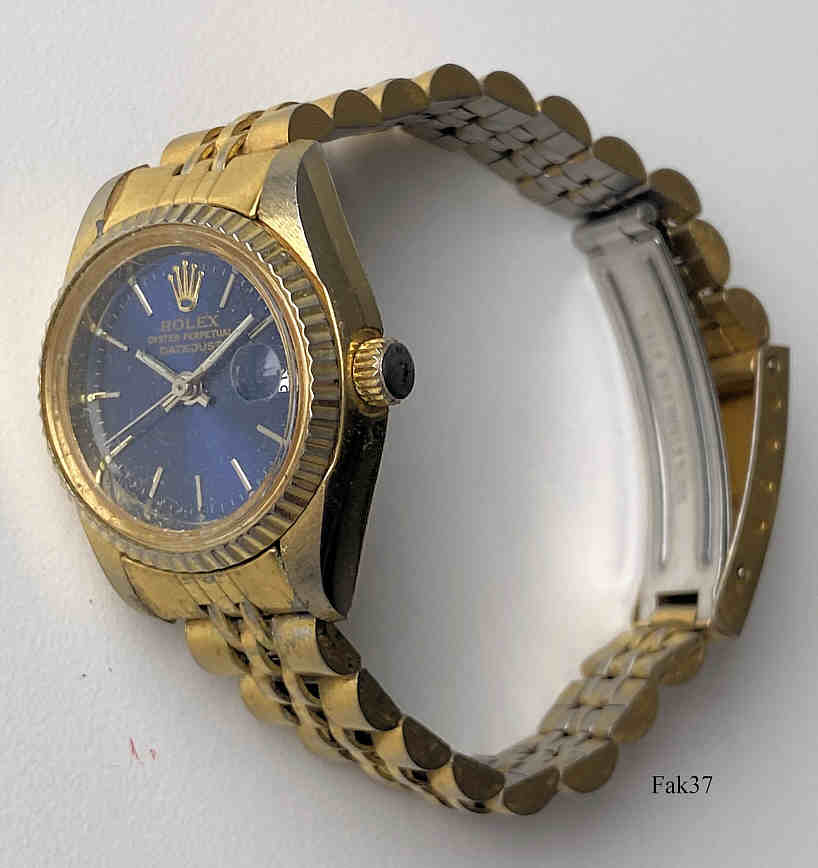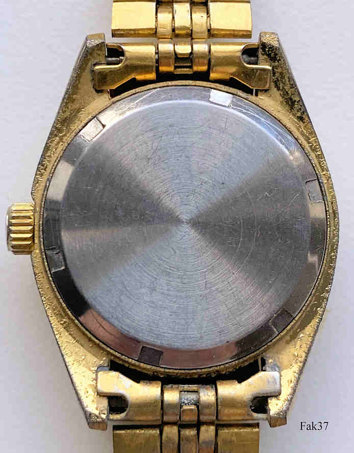 This is the copy of a Rolex Oyster datejust Ladies watch, probably from China, with a simple quartz movement. Signed front: ”Rolex, Oyster Perpetual, Datejust”, inside: ”Unadjusted, One (1) Jewel, French Parts, Hong Kong” Date at 3 with Loupe, Massive Metal Band.
