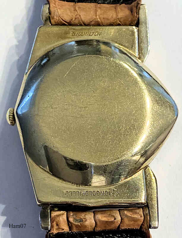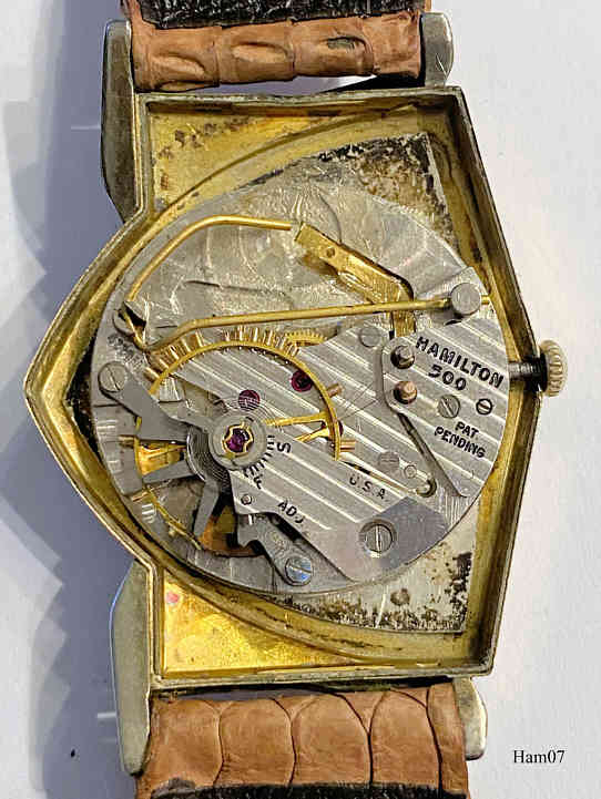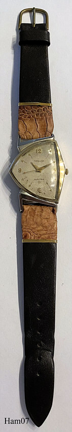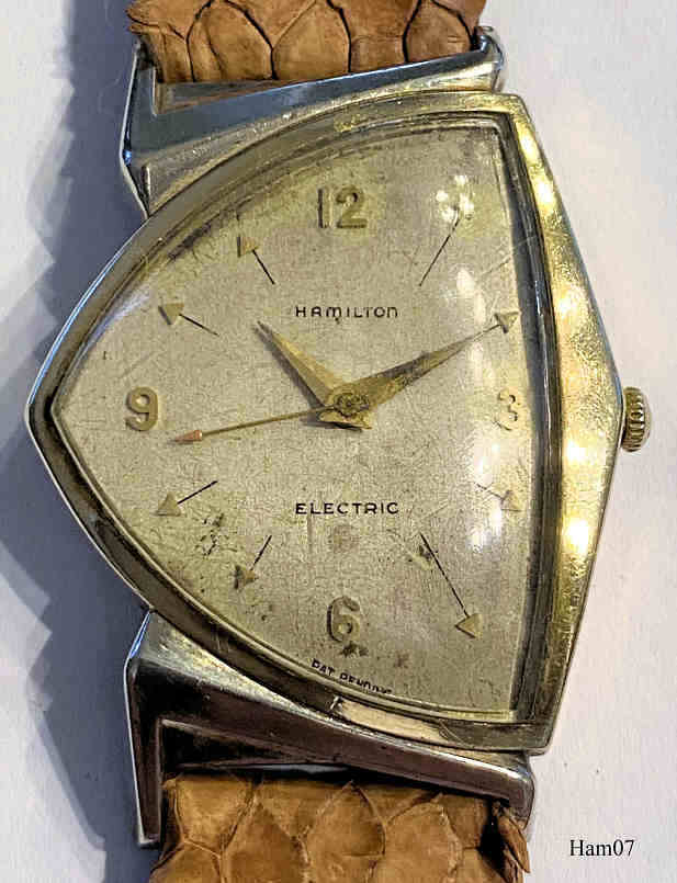This Hamilton Pacer is from 1957 and driven by a Caliber 500A. The same model in pure gold was offered as “Ventura”. y.  Signed front: “Hamilton, Electric”, back: ”10K gold filled, Hamilton”, inside: “Hamilton, 505, patented, U.S.A.”, caseback: “Hamilton W. Co., Lancaster PA., 10K gold filled, R589207, Star W.C. Co.”. The speciality of this watch is the asymetric triangular design, a modern reminiscence to this model was offered by Seiko as well as later by Graf von Monte Wehro Also Hamilton is now again offering modern versions of this design.