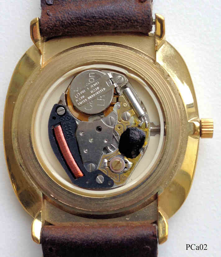 A beautiful dresswatch of Chromachron, Design classic of Pierre Cardin. Golden base Metal case. Signed front: “Pierre Cardin, Swiss Quartz”, inside: ”561.001, One 1 Jewel”, back: “Pierre Cardin, Chromachron, Swiss B-85-MS0”. Movement Caliber ETA 561.001. Brown leather band