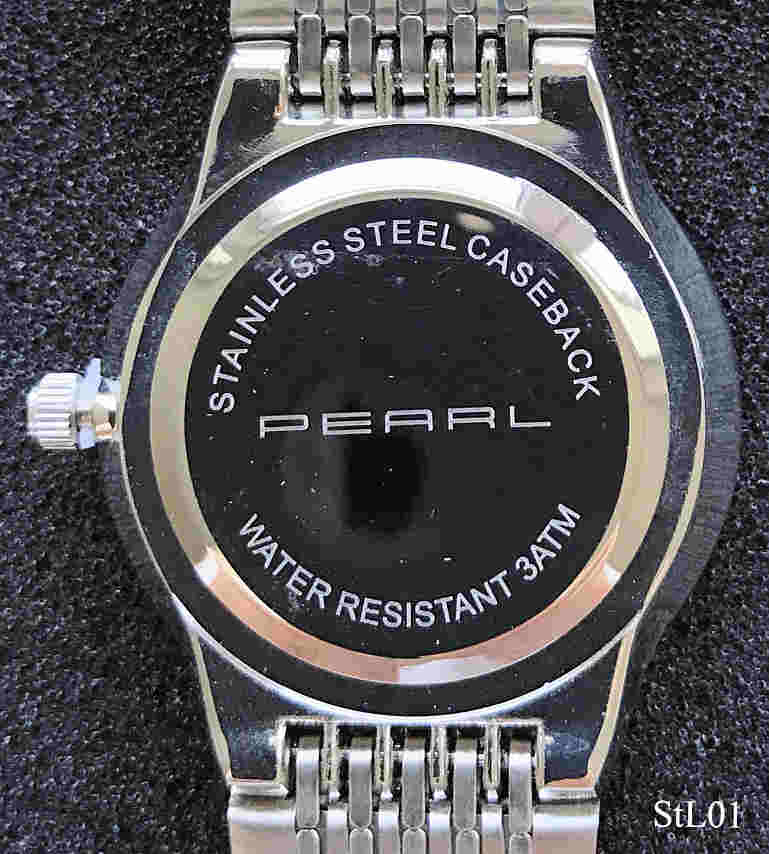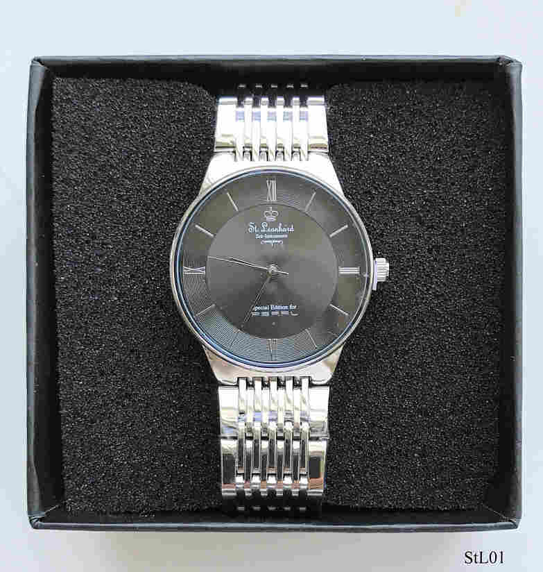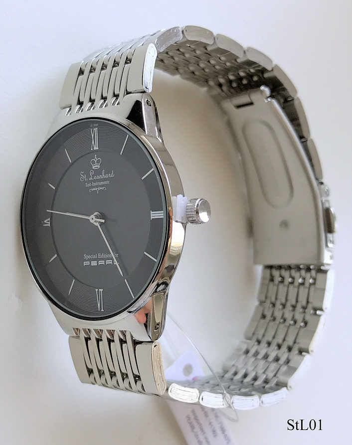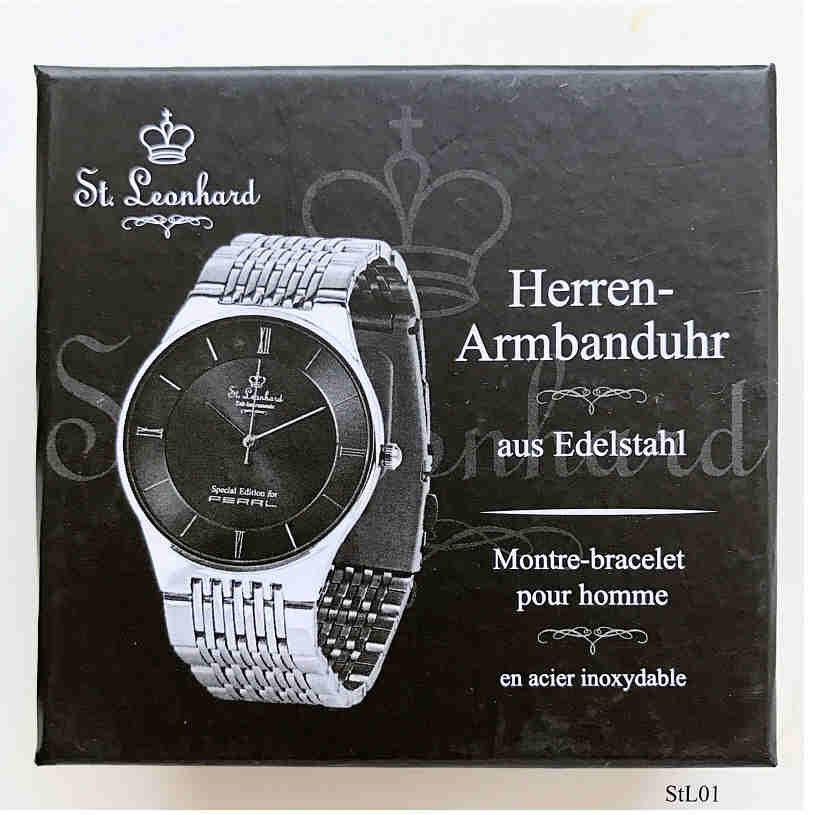 Eine Werbeuhr der Firma Pearl mit ungewöhnlicher Armbandbefestigung. Schwarzes Zifferblatt mit dunklen Zeigern. Beschriftet vorn: “St. Leonhard, Zeit-Instrumente, Special Edition for, Pearl”, hinten: ”Stainless Steel Caseback, Water Resistant 3 ATM, PEARL”, innen: “No Jewels, Unadjusted”, Integriertes Edelstahlarmband. Werbegeschenk der Firma Pearl, eine Uhr der Marke St. Leonhard.