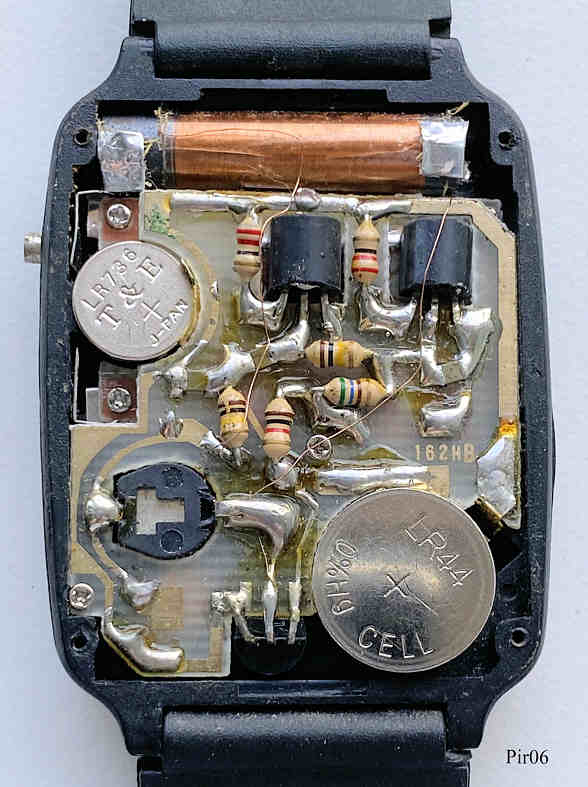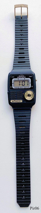 A PiratronRadio Watch, a digital watch with LCD Display: Time, Seconds, Signed front: ”Piratron, Quartz, Radio-Watch”, back: ”SB, Battery, Watch: UCC392, Radio: UCC357”. Practically thewre are two separate devices: a watch and an AM Radio. On the front to see the tuning knob, on the side the arphone jack.