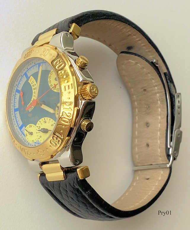 Ein Pryngeps Minute Repeater der Serie “Sound Jamaica” mit Stainless Steel Gehäuse und verschraubtem Stainless Steel Back, eine Quartz Uhr mit ewigem Kalender und Schlagwerk. Beschriftet: ”Pryngeps Minute Repeater”, hinten “Pryngeps, All Stainless Steel, Perpetual Calender, Modele Depose, Water Resistant, Sound Jamaica, 2, MR003”, innen: “Pryngeps, Minute Repeater, MR003”. Der Zeiger bei der 10 zeigt den Wochentag, bei der 2 den Tag, bei der 4 den Monat und Jahr 1-4, wobei 4 das Schaltjahr ist, bei der 6 die Weckzeit und bei der 7 der GMT Zeiger.
