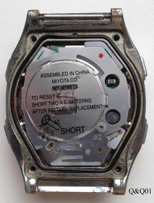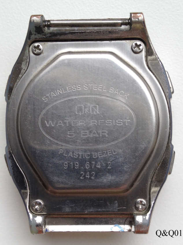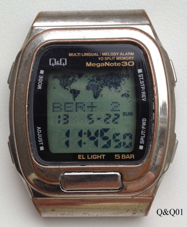 Dies ist eine Q&Q LCD Uhr, Modell “MegaNote 30” mit allen Weltzeitzonen, die im Display angezeigt werden. Funktionen: Zeitzonen, Weckzeit 1, Weckzeit 2, Notebook, Chrono, Counter. Beschriftung vorn: “Q&Q, Multi Lingual, Melody Alarm, 10 Split Memory, Mega Note 30, 5 Bar”, hinten: “Stainless Steel Back, Q&Q, Water Resist, 5 Bar, Plastic Bezel, 916.674 2, 242”, innen: “Assembled in China, Miyota Co.”. Plastic Gehäuse, Edelstahlboden,.