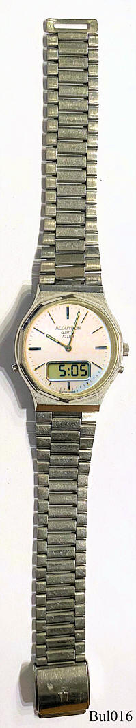 Bulova quartz Alarm, a combination of a digital and an analog quartz watch, similar to Combitron. Signed front: “Bulova, Quartz, Alarm, Swiss 6988 T”, back: “Stainless Steel Case, Bulova, P0”, inside: “Bulova 2577.10, Cell 604, unadjusted, seven (7) Jewels, Swiss made, Y2, ESA 900.911”, LCD shows the alarm time. In the back is a piezo speaker for the alarm, date of manufacture 1990 (P0). Stainless Steel band with neutral clasp.