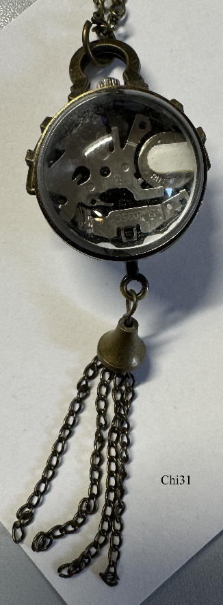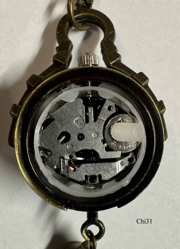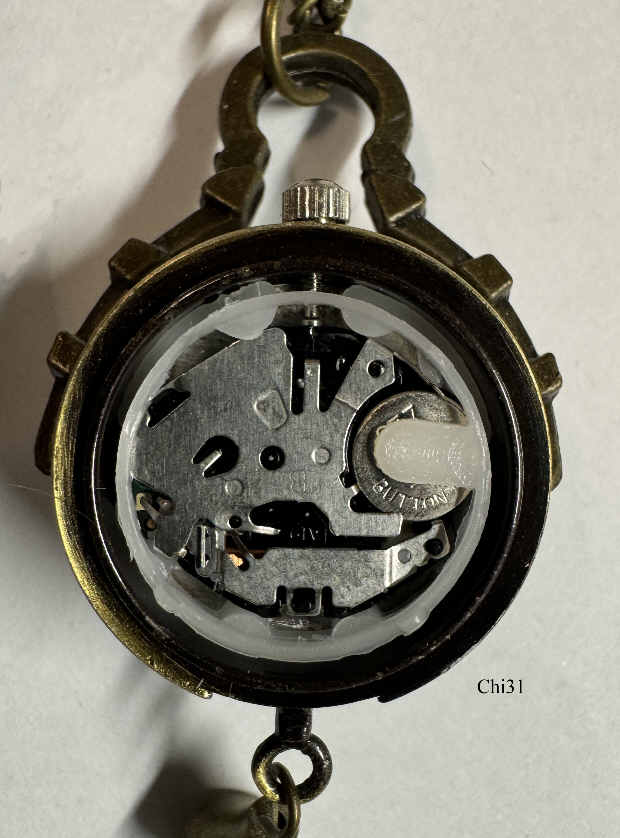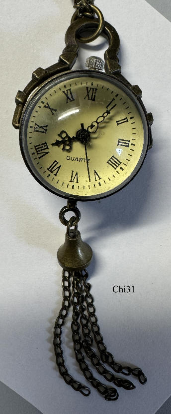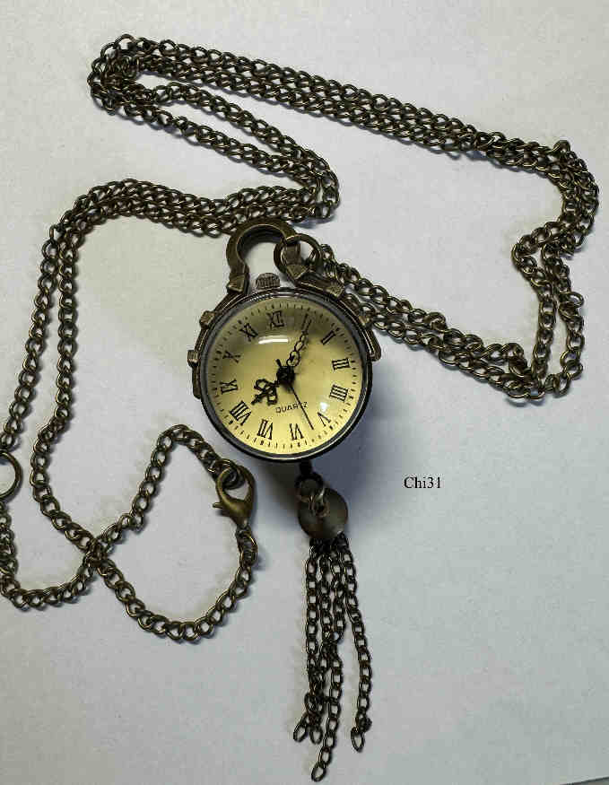 Eine Quartz Kugeluhr als Kettenuhr, wahrscheinlich aus China. Die Uhr hängt mit einem Bügel an der Kette. Beschriftet vorn: “Quartz”, innen: “B, SL2035G , A19”. Gehäuse Base Metall, Zifferblatt mit römischen Ziffern. Durch den Bügel und das untere Kettengewicht hängt die Uhr immer gut ablesbar senkrecht. Werk: Miyota SL2035G